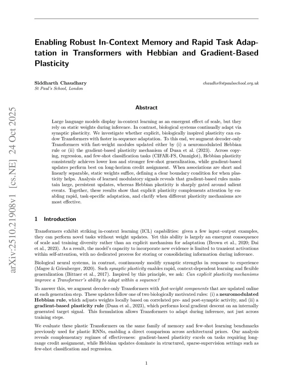 Large language models display in-context learning as an emergent effect of scale, but they rely on static weights during inference. In contrast, biological systems continually adapt via synaptic plasticity. We investigate whether explicit, biologically inspired plasticity can endow Transformers with faster in-sequence adaptation. To this end, we augment decoder-only Transformers with fast-weight modules updated either by (i) a neuromodulated Hebbian rule or (ii) the gradient-based plasticity mechanism of Duan et al. (2023). Across copying, regression, and few-shot classification tasks (CIFAR-FS, Omniglot), Hebbian plasticity consistently achieves lower loss and stronger few-shot generalization, while gradient-based updates perform best on long-horizon credit assignment. When associations are short and linearly separable, static weights suffice, defining a clear boundary condition for when plasticity helps. Analysis of learned modulatory signals reveals that gradient-based rules maintain large, persistent updates, whereas Hebbian plasticity is sharply gated around salient events. Together, these results show that explicit plasticity complements attention by enabling rapid, task-specific adaptation, and clarify when different plasticity mechanisms are most effective.