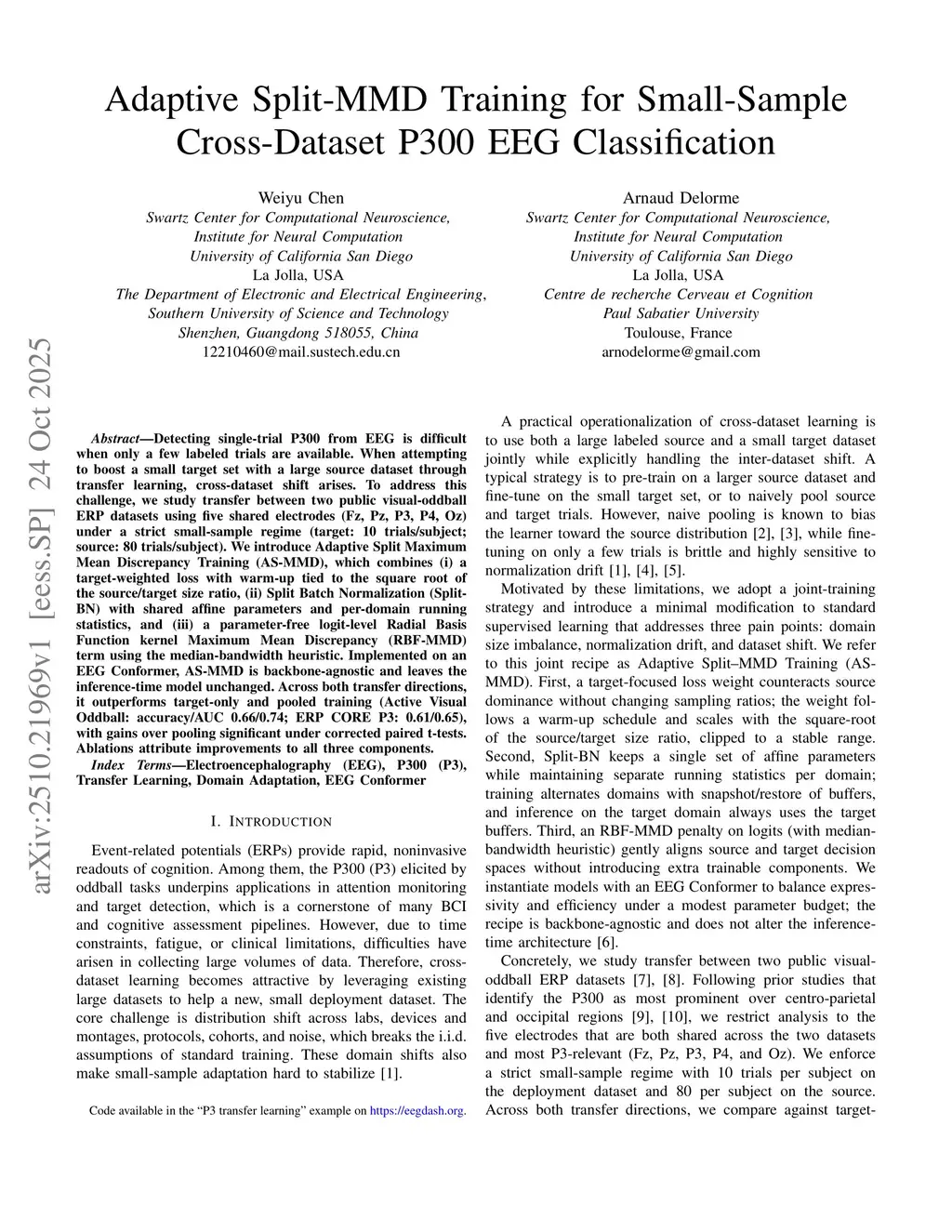 Adaptive Split-MMD Training for Small-Sample Cross-Dataset P300 EEG Classification