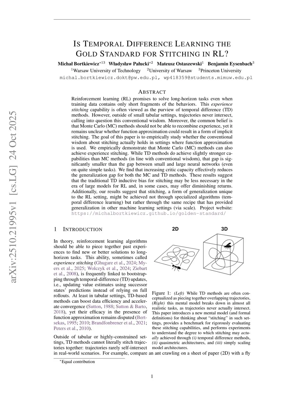 Reinforcement learning (RL) promises to solve long-horizon tasks even when training data contains only short fragments of the behaviors. This experience stitching capability is often viewed as the purview of temporal difference (TD) methods. However, outside of small tabular settings, trajectories never intersect, calling into question this conventional wisdom. Moreover, the common belief is that Monte Carlo (MC) methods should not be able to recombine experience, yet it remains unclear whether function approximation could result in a form of implicit stitching. The goal of this paper is to empirically study whether the conventional wisdom about stitching actually holds in settings where function approximation is used. We empirically demonstrate that Monte Carlo (MC) methods can also achieve experience stitching. While TD methods do achieve slightly stronger capabilities than MC methods (in line with conventional wisdom), that gap is significantly smaller than the gap between small and large neural networks (even on quite simple tasks). We find that increasing critic capacity effectively reduces the generalization gap for both the MC and TD methods. These results suggest that the traditional TD inductive bias for stitching may be less necessary in the era of large models for RL and, in some cases, may offer diminishing returns. Additionally, our results suggest that stitching, a form of generalization unique to the RL setting, might be achieved not through specialized algorithms (temporal difference learning) but rather through the same recipe that has provided generalization in other machine learning settings (via scale). Project website:this https URL