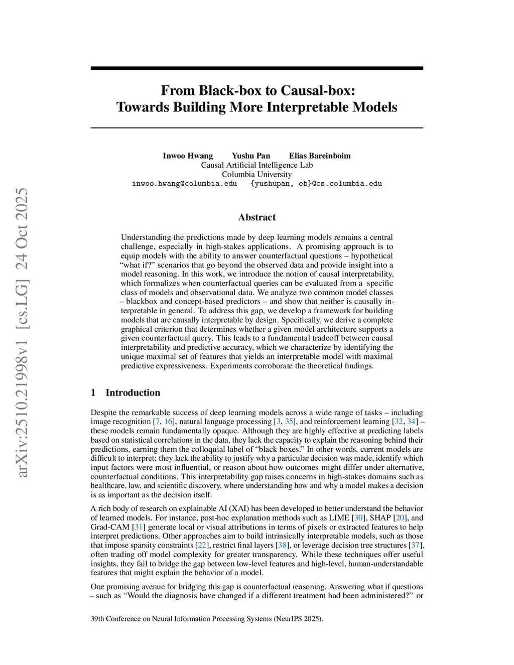 Understanding the predictions made by deep learning models remains a central challenge, especially in high-stakes applications. A promising approach is to equip models with the ability to answer counterfactual questions -- hypothetical ``what if?'' scenarios that go beyond the observed data and provide insight into a model reasoning. In this work, we introduce the notion of causal interpretability, which formalizes when counterfactual queries can be evaluated from a specific class of models and observational data. We analyze two common model classes -- blackbox and concept-based predictors -- and show that neither is causally interpretable in general. To address this gap, we develop a framework for building models that are causally interpretable by design. Specifically, we derive a complete graphical criterion that determines whether a given model architecture supports a given counterfactual query. This leads to a fundamental tradeoff between causal interpretability and predictive accuracy, which we characterize by identifying the unique maximal set of features that yields an interpretable model with maximal predictive expressiveness. Experiments corroborate the theoretical findings.