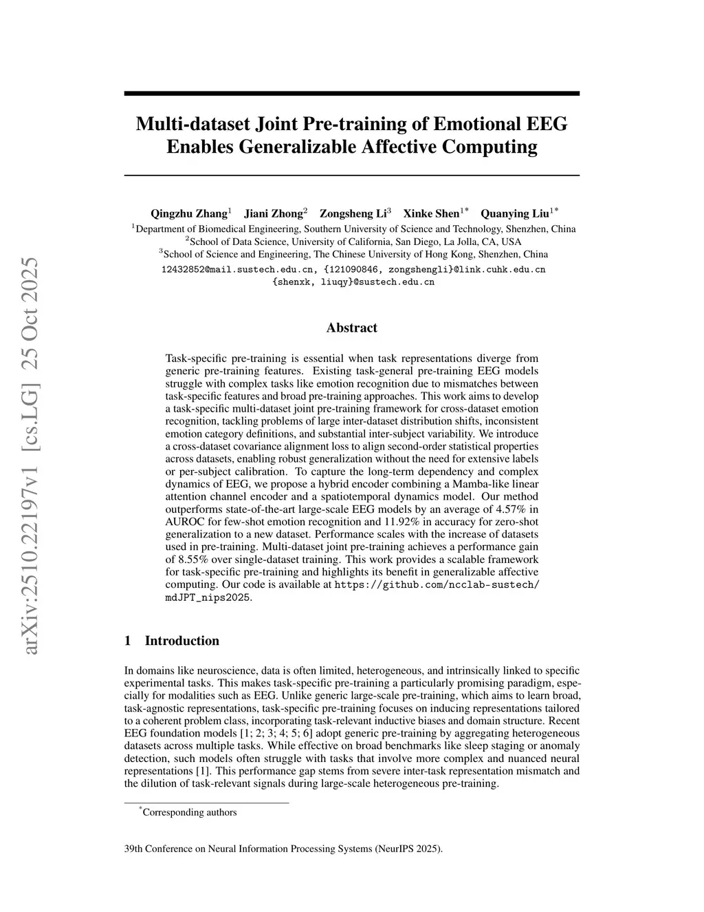 Task-specific pre-training is essential when task representations diverge from generic pre-training features. Existing task-general pre-training EEG models struggle with complex tasks like emotion recognition due to mismatches between task-specific features and broad pre-training approaches. This work aims to develop a task-specific multi-dataset joint pre-training framework for cross-dataset emotion recognition, tackling problems of large inter-dataset distribution shifts, inconsistent emotion category definitions, and substantial inter-subject variability. We introduce a cross-dataset covariance alignment loss to align second-order statistical properties across datasets, enabling robust generalization without the need for extensive labels or per-subject calibration. To capture the long-term dependency and complex dynamics of EEG, we propose a hybrid encoder combining a Mamba-like linear attention channel encoder and a spatiotemporal dynamics model. Our method outperforms state-of-the-art large-scale EEG models by an average of 4.57% in AUROC for few-shot emotion recognition and 11.92% in accuracy for zero-shot generalization to a new dataset. Performance scales with the increase of datasets used in pre-training. Multi-dataset joint pre-training achieves a performance gain of 8.55% over single-dataset training. This work provides a scalable framework for task-specific pre-training and highlights its benefit in generalizable affective computing. Our code is available atthis https URL.
