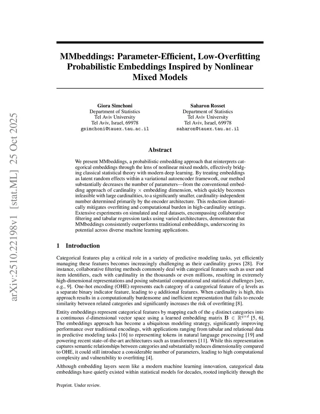 We present MMbeddings, a probabilistic embedding approach that reinterprets categorical embeddings through the lens of nonlinear mixed models, effectively bridging classical statistical theory with modern deep learning. By treating embeddings as latent random effects within a variational autoencoder framework, our method substantially decreases the number of parameters -- from the conventional embedding approach of cardinality embedding dimension, which quickly becomes infeasible with large cardinalities, to a significantly smaller, cardinality-independent number determined primarily by the encoder architecture. This reduction dramatically mitigates overfitting and computational burden in high-cardinality settings. Extensive experiments on simulated and real datasets, encompassing collaborative filtering and tabular regression tasks using varied architectures, demonstrate that MMbeddings consistently outperforms traditional embeddings, underscoring its potential across diverse machine learning applications.