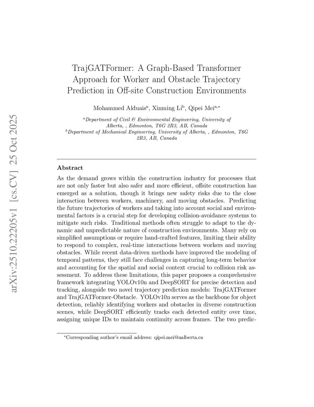 As the demand grows within the construction industry for processes that are not only faster but also safer and more efficient, offsite construction has emerged as a solution, though it brings new safety risks due to the close interaction between workers, machinery, and moving obstacles. Predicting the future trajectories of workers and taking into account social and environmental factors is a crucial step for developing collision-avoidance systems to mitigate such risks. Traditional methods often struggle to adapt to the dynamic and unpredictable nature of construction environments. Many rely on simplified assumptions or require hand-crafted features, limiting their ability to respond to complex, real-time interactions between workers and moving obstacles. While recent data-driven methods have improved the modeling of temporal patterns, they still face challenges in capturing long-term behavior and accounting for the spatial and social context crucial to collision risk assessment. To address these limitations, this paper proposes a framework integrating YOLOv10n and DeepSORT for precise detection and tracking, along with two novel trajectory prediction models: TrajGATFormer and TrajGATFormer-Obstacle. YOLOv10n serves as the backbone for object detection, accurately identifying workers and obstacles in diverse scenes, while DeepSORT efficiently tracks them over time with unique IDs for continuity. Both models employ a transformer encoder-decoder with Graph Attention Networks (GAT) to capture temporal and spatial interactions. TrajGATFormer predicts worker trajectories with an ADE of 1.25 m and FDE of 2.3 m over a 4.8 s horizon, while TrajGATFormer-Obstacle extends prediction to both workers and obstacles, achieving higher accuracy (ADE 1.15 m, FDE 2.2 m). Comparative analysis shows both models outperform traditional methods, reducing ADE and FDE by up to 35% and 38%, respectively.