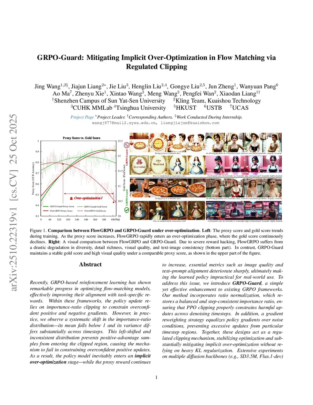 Recently, GRPO-based reinforcement learning has shown remarkable progress in optimizing flow-matching models, effectively improving their alignment with task-specific rewards. Within these frameworks, the policy update relies on importance-ratio clipping to constrain overconfident positive and negative gradients. However, in practice, we observe a systematic shift in the importance-ratio distribution-its mean falls below 1 and its variance differs substantially across timesteps. This left-shifted and inconsistent distribution prevents positive-advantage samples from entering the clipped region, causing the mechanism to fail in constraining overconfident positive updates. As a result, the policy model inevitably enters an implicit over-optimization stage-while the proxy reward continues to increase, essential metrics such as image quality and text-prompt alignment deteriorate sharply, ultimately making the learned policy impractical for real-world use. To address this issue, we introduce GRPO-Guard, a simple yet effective enhancement to existing GRPO frameworks. Our method incorporates ratio normalization, which restores a balanced and step-consistent importance ratio, ensuring that PPO clipping properly constrains harmful updates across denoising timesteps. In addition, a gradient reweighting strategy equalizes policy gradients over noise conditions, preventing excessive updates from particular timestep regions. Together, these designs act as a regulated clipping mechanism, stabilizing optimization and substantially mitigating implicit over-optimization without relying on heavy KL regularization. Extensive experiments on multiple diffusion backbones (e.g., SD3.5M, Flux.1-dev) and diverse proxy tasks demonstrate that GRPO-Guard significantly reduces over-optimization while maintaining or even improving generation quality.