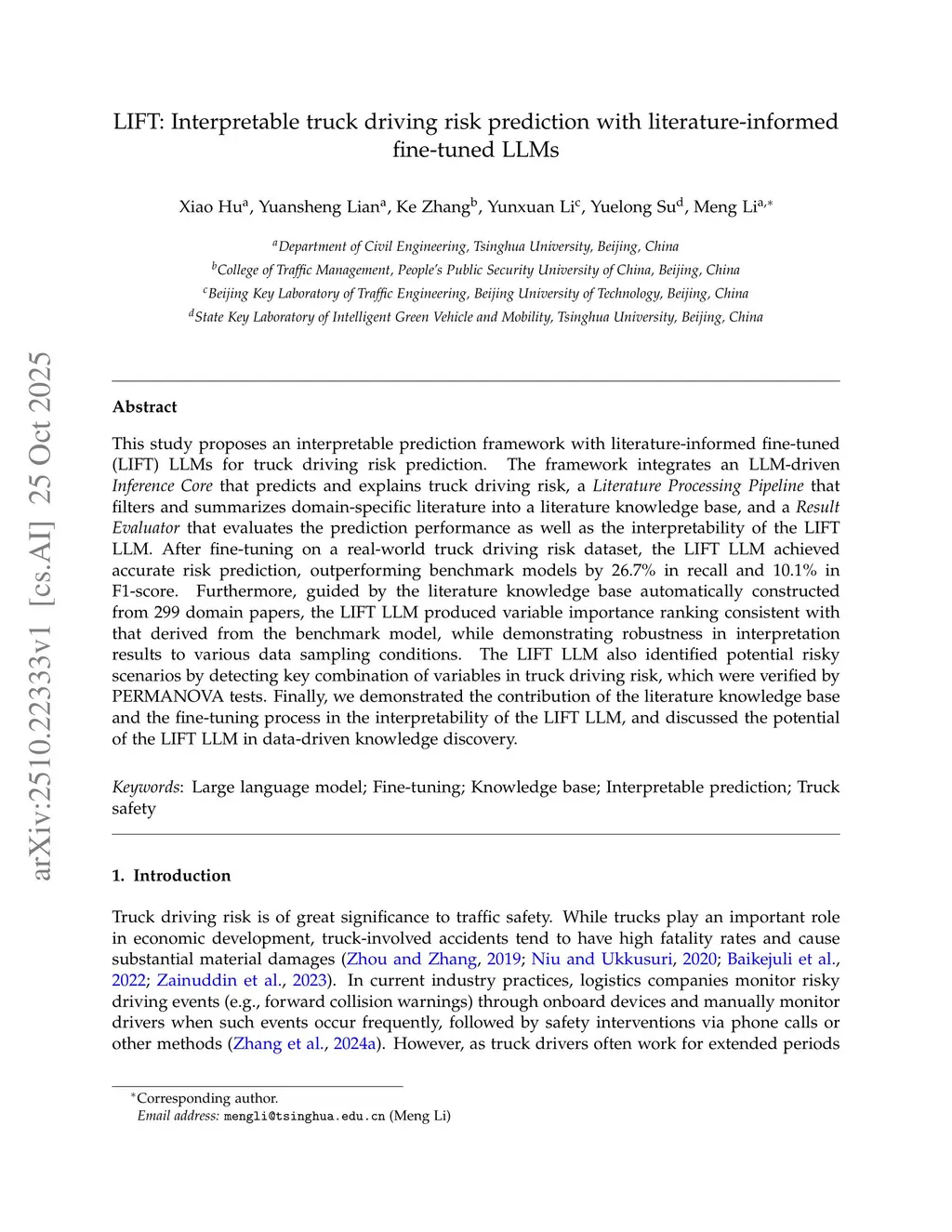 LIFT: Interpretable truck driving risk prediction with literature-informed fine-tuned LLMs