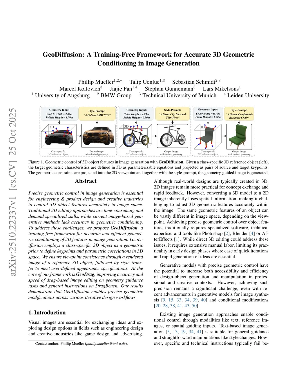 Precise geometric control in image generation is essential for engineering \& product design and creative industries to control 3D object features accurately in image space. Traditional 3D editing approaches are time-consuming and demand specialized skills, while current image-based generative methods lack accuracy in geometric conditioning. To address these challenges, we propose GeoDiffusion, a training-free framework for accurate and efficient geometric conditioning of 3D features in image generation. GeoDiffusion employs a class-specific 3D object as a geometric prior to define keypoints and parametric correlations in 3D space. We ensure viewpoint consistency through a rendered image of a reference 3D object, followed by style transfer to meet user-defined appearance specifications. At the core of our framework is GeoDrag, improving accuracy and speed of drag-based image editing on geometry guidance tasks and general instructions on DragBench. Our results demonstrate that GeoDiffusion enables precise geometric modifications across various iterative design workflows.