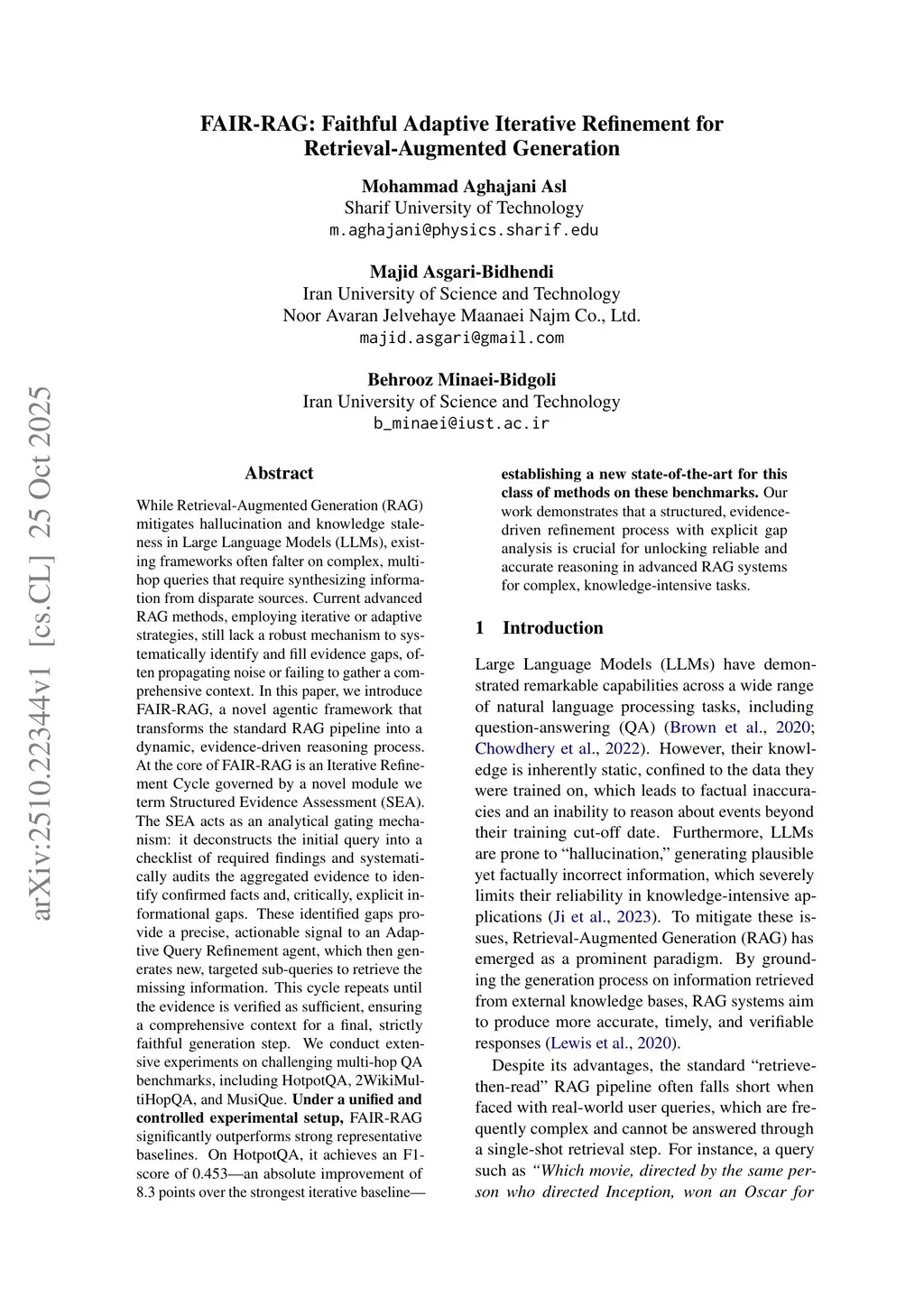 While Retrieval-Augmented Generation (RAG) mitigates hallucination and knowledge staleness in Large Language Models (LLMs), existing frameworks often falter on complex, multi-hop queries that require synthesizing information from disparate sources. Current advanced RAG methods, employing iterative or adaptive strategies, lack a robust mechanism to systematically identify and fill evidence gaps, often propagating noise or failing to gather a comprehensive context. We introduce FAIR-RAG, a novel agentic framework that transforms the standard RAG pipeline into a dynamic, evidence-driven reasoning process. At its core is an Iterative Refinement Cycle governed by a module we term Structured Evidence Assessment (SEA). The SEA acts as an analytical gating mechanism: it deconstructs the initial query into a checklist of required findings and audits the aggregated evidence to identify confirmed facts and, critically, explicit informational gaps. These gaps provide a precise signal to an Adaptive Query Refinement agent, which generates new, targeted sub-queries to retrieve missing information. This cycle repeats until the evidence is verified as sufficient, ensuring a comprehensive context for a final, strictly faithful generation. We conducted experiments on challenging multi-hop QA benchmarks, including HotpotQA, 2WikiMultiHopQA, and MusiQue. In a unified experimental setup, FAIR-RAG significantly outperforms strong baselines. On HotpotQA, it achieves an F1-score of 0.453 -- an absolute improvement of 8.3 points over the strongest iterative baseline -- establishing a new state-of-the-art for this class of methods on these benchmarks. Our work demonstrates that a structured, evidence-driven refinement process with explicit gap analysis is crucial for unlocking reliable and accurate reasoning in advanced RAG systems for complex, knowledge-intensive tasks.