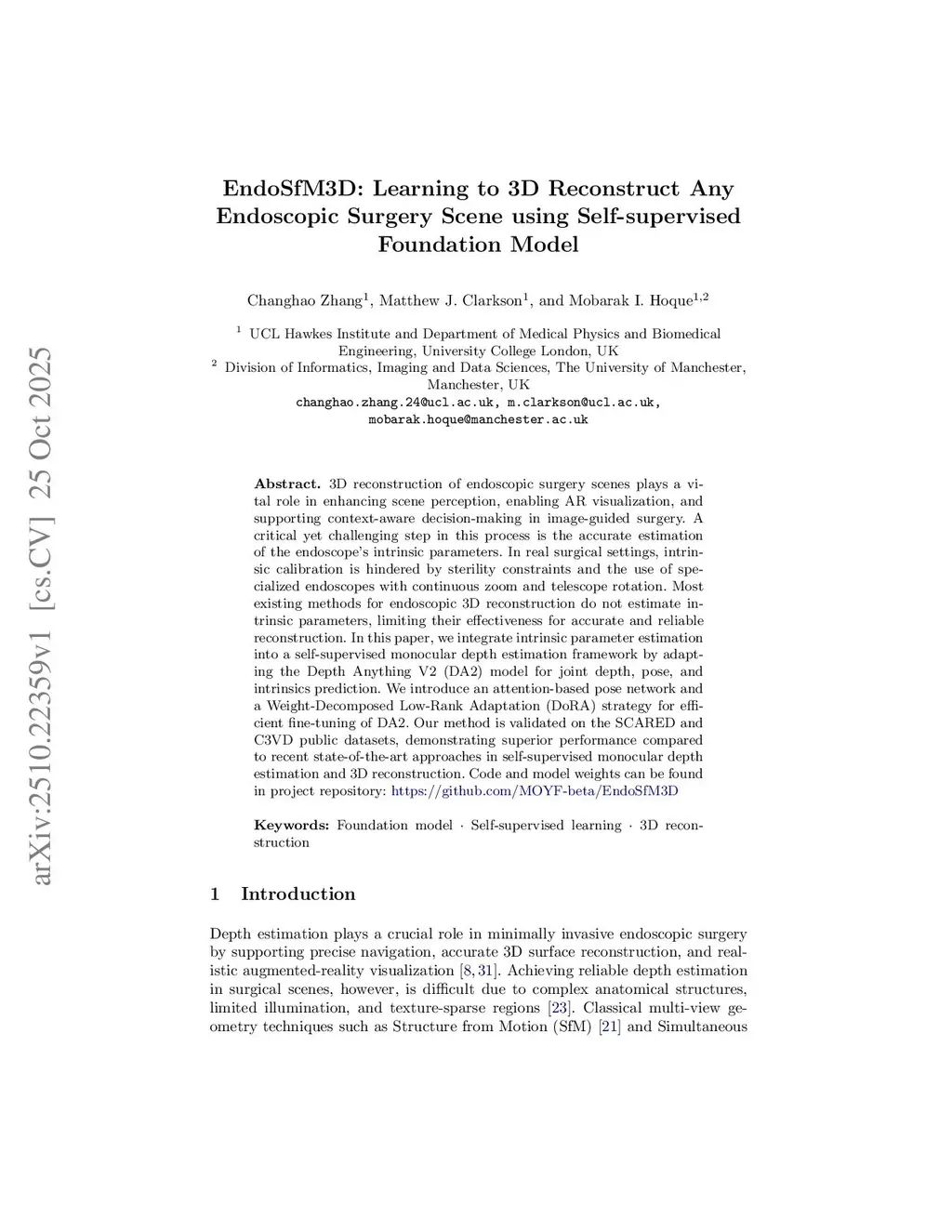 3D reconstruction of endoscopic surgery scenes plays a vital role in enhancing scene perception, enabling AR visualization, and supporting context-aware decision-making in image-guided surgery. A critical yet challenging step in this process is the accurate estimation of the endoscope's intrinsic parameters. In real surgical settings, intrinsic calibration is hindered by sterility constraints and the use of specialized endoscopes with continuous zoom and telescope rotation. Most existing methods for endoscopic 3D reconstruction do not estimate intrinsic parameters, limiting their effectiveness for accurate and reliable reconstruction. In this paper, we integrate intrinsic parameter estimation into a self-supervised monocular depth estimation framework by adapting the Depth Anything V2 (DA2) model for joint depth, pose, and intrinsics prediction. We introduce an attention-based pose network and a Weight-Decomposed Low-Rank Adaptation (DoRA) strategy for efficient fine-tuning of DA2. Our method is validated on the SCARED and C3VD public datasets, demonstrating superior performance compared to recent state-of-the-art approaches in self-supervised monocular depth estimation and 3D reconstruction. Code and model weights can be found in project repository:this https URL.