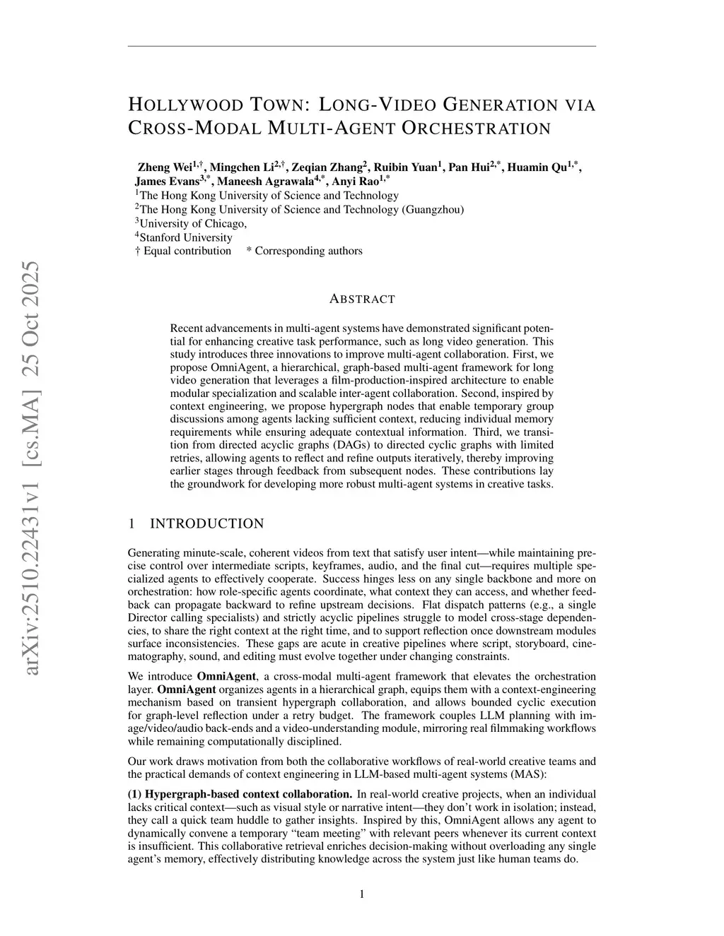 Recent advancements in multi-agent systems have demonstrated significant potential for enhancing creative task performance, such as long video generation. This study introduces three innovations to improve multi-agent collaboration. First, we propose OmniAgent, a hierarchical, graph-based multi-agent framework for long video generation that leverages a film-production-inspired architecture to enable modular specialization and scalable inter-agent collaboration. Second, inspired by context engineering, we propose hypergraph nodes that enable temporary group discussions among agents lacking sufficient context, reducing individual memory requirements while ensuring adequate contextual information. Third, we transition from directed acyclic graphs (DAGs) to directed cyclic graphs with limited retries, allowing agents to reflect and refine outputs iteratively, thereby improving earlier stages through feedback from subsequent nodes. These contributions lay the groundwork for developing more robust multi-agent systems in creative tasks.
