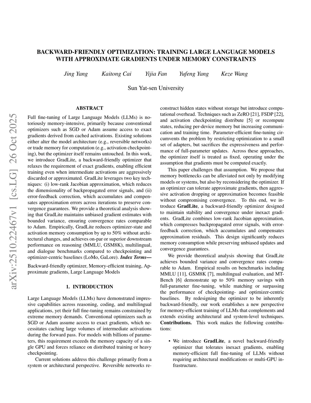 Full fine-tuning of Large Language Models (LLMs) is notoriously memory-intensive, primarily because conventional optimizers such as SGD or Adam assume access to exact gradients derived from cached activations. Existing solutions either alter the model architecture (e.g., reversible networks) or trade memory for computation (e.g., activation checkpointing), but the optimizer itself remains untouched. In this work, we introduce GradLite, a backward-friendly optimizer that relaxes the requirement of exact gradients, enabling efficient training even when intermediate activations are aggressively discarded or approximated. GradLite leverages two key techniques: (i) low-rank Jacobian approximation, which reduces the dimensionality of backpropagated error signals, and (ii) error-feedback correction, which accumulates and compensates approximation errors across iterations to preserve convergence guarantees. We provide a theoretical analysis showing that GradLite maintains unbiased gradient estimates with bounded variance, ensuring convergence rates comparable to Adam. Empirically, GradLite reduces optimizer-state and activation memory consumption by up to 50\% without architectural changes, and achieves on-par or superior downstream performance on reasoning (MMLU, GSM8K), multilingual, and dialogue benchmarks compared to checkpointing and optimizer-centric baselines (LoMo, GaLore).