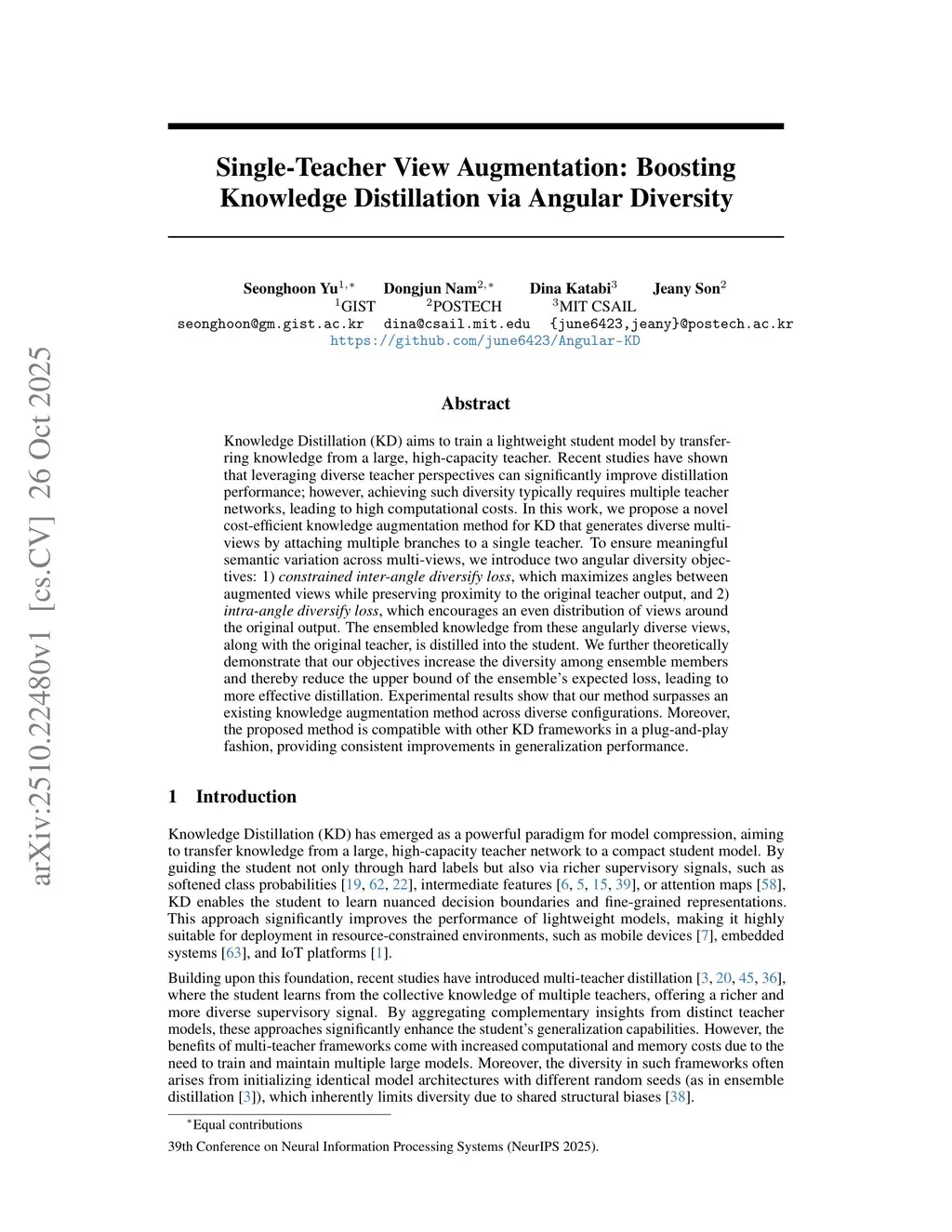 Single-Teacher View Augmentation: Boosting Knowledge Distillation via Angular Diversity