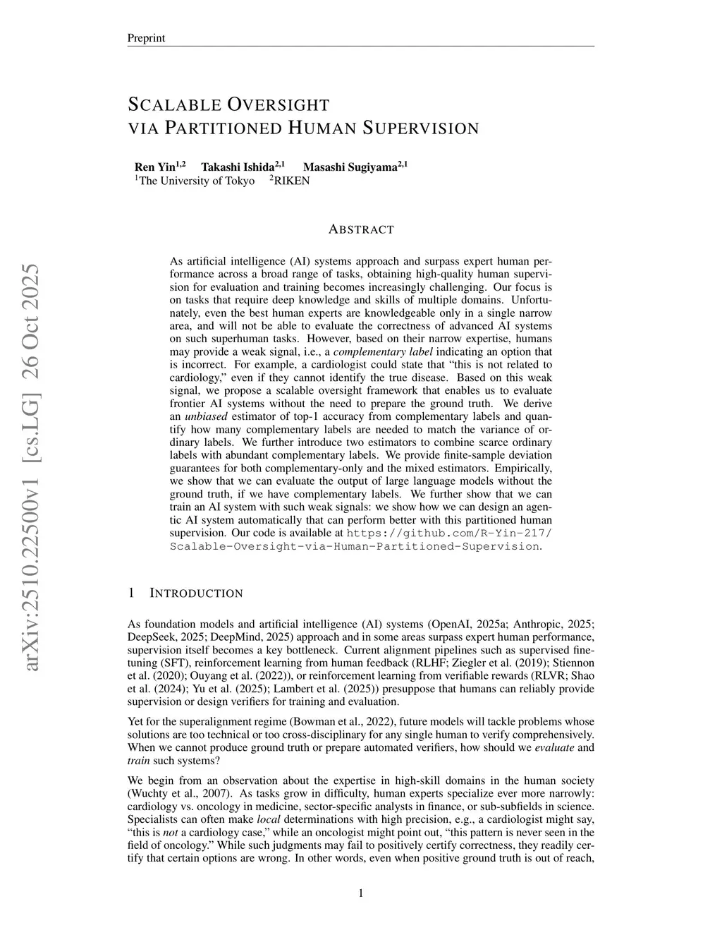 As artificial intelligence (AI) systems approach and surpass expert human performance across a broad range of tasks, obtaining high-quality human supervision for evaluation and training becomes increasingly challenging. Our focus is on tasks that require deep knowledge and skills of multiple domains, where this bottleneck is severe. Unfortunately, even the best human experts are knowledgeable only in a single narrow area, and will not be able to evaluate the correctness of advanced AI systems on such superhuman tasks. However, based on their narrow expertise, humans may provide a weak signal, i.e., a complementary label indicating an option that is incorrect. For example, a cardiologist could state that ''this is not related to any cardiovascular disease,'' even if they cannot identify the true disease. Based on this weak signal, we propose a scalable oversight framework that enables us to evaluate frontier AI systems without the need to prepare the ground truth. We derive an unbiased estimator of top-1 accuracy from complementary labels and quantify how many complementary labels are needed to match the variance of ordinary labels. We further introduce two estimators to combine scarce ordinary labels with abundant complementary labels. We provide finite-sample deviation guarantees for both complementary-only and the mixed estimators. Empirically, we show that we can evaluate the output of large language models without the ground truth, if we have complementary labels. We further show that we can train an AI system with such weak signals: we show how we can design an agentic AI system automatically that can improve itself with this partitioned human supervision. Our code is available atthis https URL.