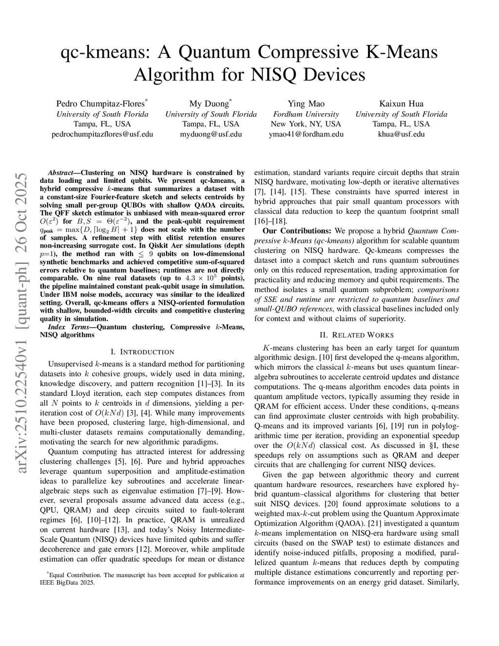 Clustering on NISQ hardware is constrained by data loading and limited qubits. We present \textbf{qc-kmeans}, a hybrid compressive -means that summarizes a dataset with a constant-size Fourier-feature sketch and selects centroids by solving small per-group QUBOs with shallow QAOA circuits. The QFF sketch estimator is unbiased with mean-squared error for , and the peak-qubit requirement does not scale with the number of samples. A refinement step with elitist retention ensures non-increasing surrogate cost. In Qiskit Aer simulations (depth ), the method ran with qubits on low-dimensional synthetic benchmarks and achieved competitive sum-of-squared errors relative to quantum baselines; runtimes are not directly comparable. On nine real datasets (up to points), the pipeline maintained constant peak-qubit usage in simulation. Under IBM noise models, accuracy was similar to the idealized setting. Overall, qc-kmeans offers a NISQ-oriented formulation with shallow, bounded-width circuits and competitive clustering quality in simulation.