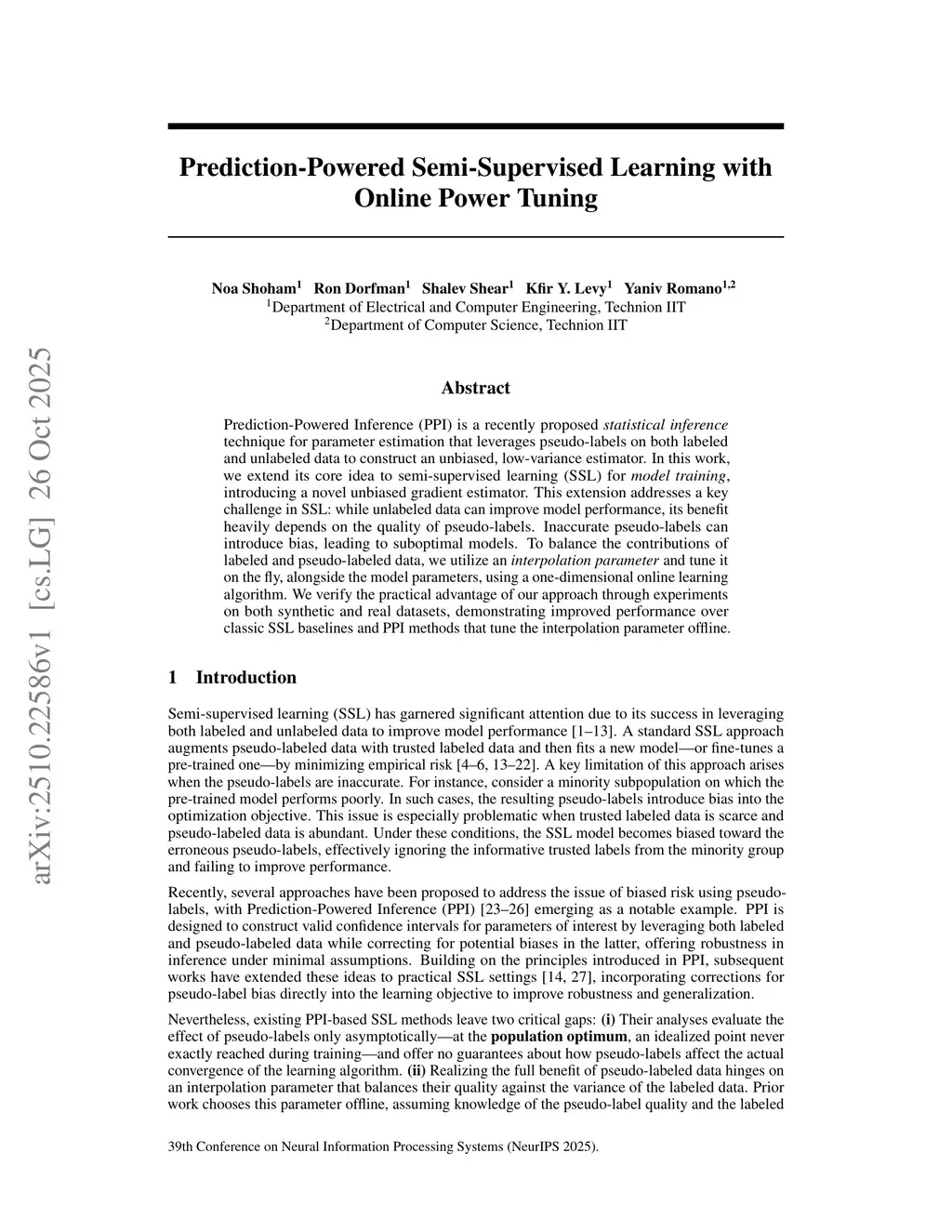 Prediction-Powered Inference (PPI) is a recently proposed statistical inference technique for parameter estimation that leverages pseudo-labels on both labeled and unlabeled data to construct an unbiased, low-variance estimator. In this work, we extend its core idea to semi-supervised learning (SSL) for model training, introducing a novel unbiased gradient estimator. This extension addresses a key challenge in SSL: while unlabeled data can improve model performance, its benefit heavily depends on the quality of pseudo-labels. Inaccurate pseudo-labels can introduce bias, leading to suboptimalthis http URLbalance the contributions of labeled and pseudo-labeled data, we utilize an interpolation parameter and tune it on the fly, alongside the model parameters, using a one-dimensional online learning algorithm. We verify the practical advantage of our approach through experiments on both synthetic and real datasets, demonstrating improved performance over classic SSL baselines and PPI methods that tune the interpolation parameter offline.