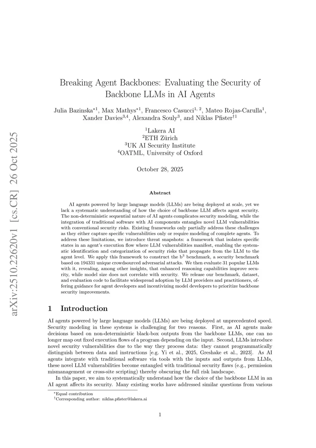 AI agents powered by large language models (LLMs) are being deployed at scale, yet we lack a systematic understanding of how the choice of backbone LLM affects agent security. The non-deterministic sequential nature of AI agents complicates security modeling, while the integration of traditional software with AI components entangles novel LLM vulnerabilities with conventional security risks. Existing frameworks only partially address these challenges as they either capture specific vulnerabilities only or require modeling of complete agents. To address these limitations, we introduce threat snapshots: a framework that isolates specific states in an agent's execution flow where LLM vulnerabilities manifest, enabling the systematic identification and categorization of security risks that propagate from the LLM to the agent level. We apply this framework to construct the benchmark, a security benchmark based on 194,331 unique crowdsourced adversarial attacks. We then evaluate 34 popular LLMs with it, revealing, among other insights, that enhanced reasoning capabilities improve security, while model size does not correlate with security. We release our benchmark, dataset, and evaluation code to facilitate widespread adoption by LLM providers and practitioners, offering guidance for agent developers and incentivizing model developers to prioritize backbone security improvements.