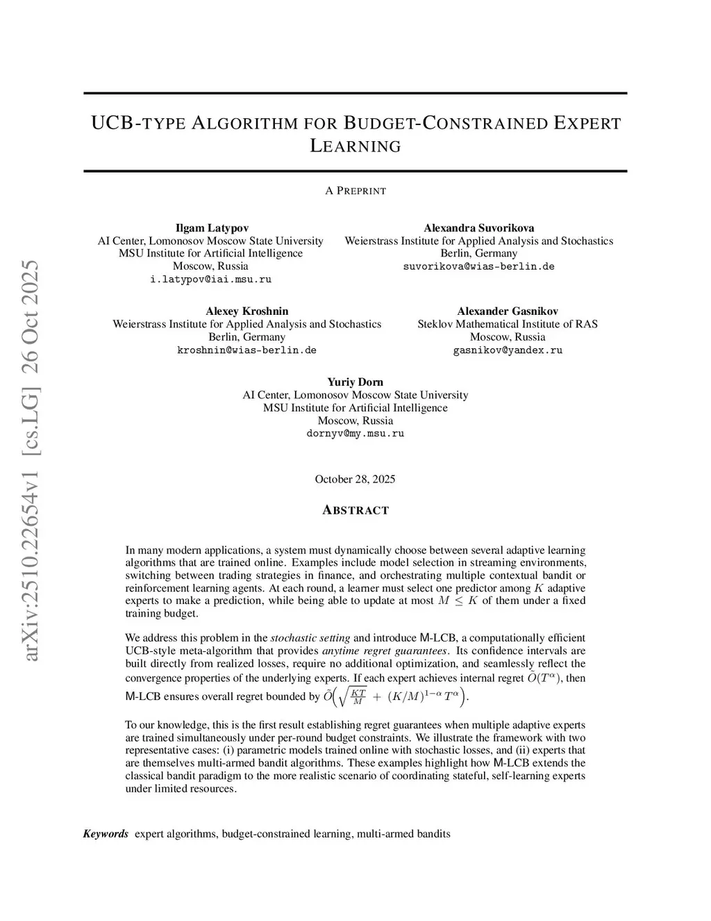 In many modern applications, a system must dynamically choose between several adaptive learning algorithms that are trained online. Examples include model selection in streaming environments, switching between trading strategies in finance, and orchestrating multiple contextual bandit or reinforcement learning agents. At each round, a learner must select one predictor among adaptive experts to make a prediction, while being able to update at most of them under a fixed training budget.We address this problem in the \emph{stochastic setting} and introduce \algname{M-LCB}, a computationally efficient UCB-style meta-algorithm that provides \emph{anytime regret guarantees}. Its confidence intervals are built directly from realized losses, require no additional optimization, and seamlessly reflect the convergence properties of the underlying experts. If each expert achieves internal regret , then \algname{M-LCB} ensures overall regret bounded by .To our knowledge, this is the first result establishing regret guarantees when multiple adaptive experts are trained simultaneously under per-round budget constraints. We illustrate the framework with two representative cases: (i) parametric models trained online with stochastic losses, and (ii) experts that are themselves multi-armed bandit algorithms. These examples highlight how \algname{M-LCB} extends the classical bandit paradigm to the more realistic scenario of coordinating stateful, self-learning experts under limited resources.