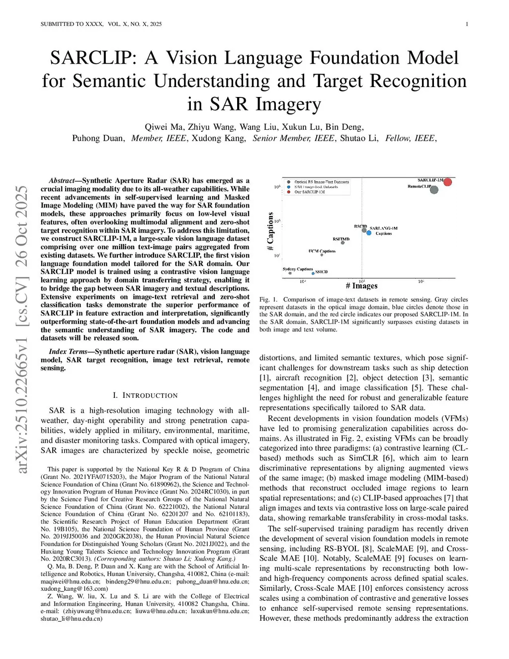 Synthetic Aperture Radar (SAR) is a crucial imaging modality thanks to its all-weather capability. Although recent advances in self-supervised learning and masked image modeling (MIM) have enabled SAR foundation models, these methods largely emphasize low-level visual features and often overlook multimodal alignment and zero-shot target recognition in SAR imagery. To address this, we construct SARVLM-1M, a large-scale vision-language dataset with over one million image-text pairs aggregated from existing datasets. We further propose a domain transfer training strategy to mitigate the large gap between natural and SAR imagery. Building on this, we develop SARVLM, the first vision language foundation model (VLM) tailored to SAR, comprising SARCLIP and SARCap. SARVLM is trained with a vision-language contrastive objective under the proposed domain transfer strategy, bridging SAR imagery and textual descriptions. Extensive experiments on image text retrieval, zero-shot classification, semantic localization, and imagery captioning demonstrate that SARVLM delivers superior feature extraction and interpretation, outperforming state-of-the-art VLMs and advancing SAR semantic understanding. Code and datasets will be released soon.