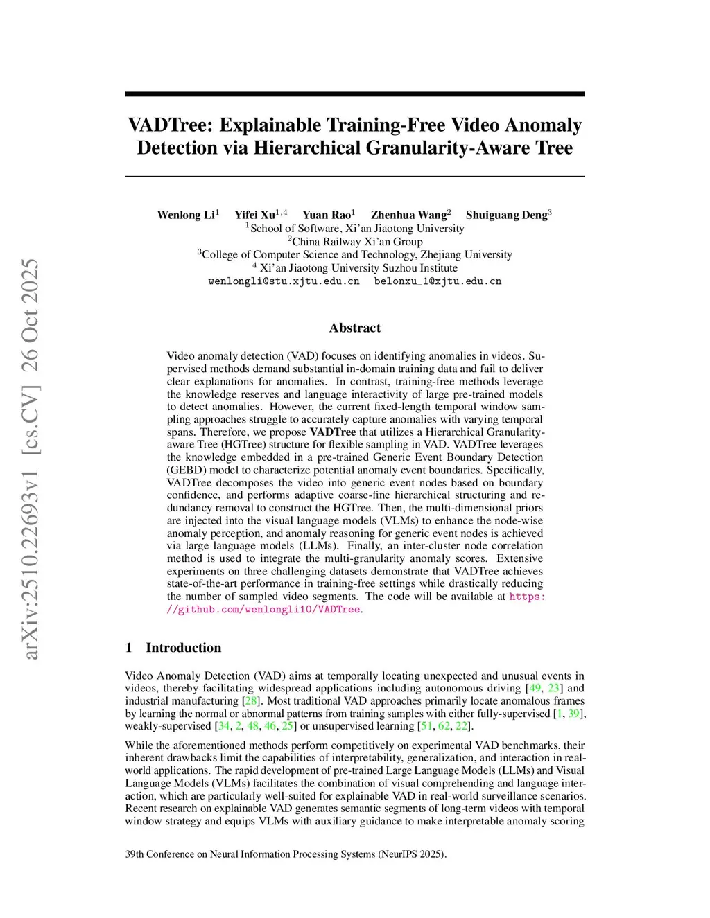 VADTree: Explainable Training-Free Video Anomaly Detection via Hierarchical Granularity-Aware Tree
