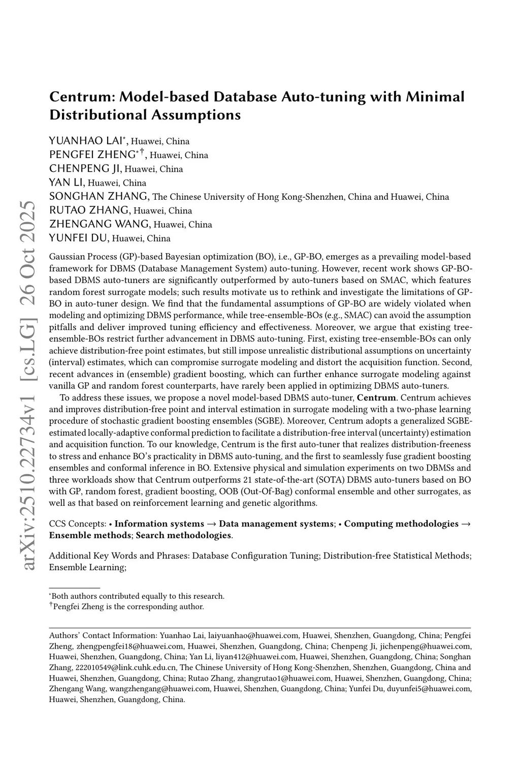 Gaussian-Process-based Bayesian optimization (GP-BO), is a prevailing model-based framework for DBMS auto-tuning. However, recent work shows GP-BO-based DBMS auto-tuners significantly outperformed auto-tuners based on SMAC, which features random forest surrogate models; such results motivate us to rethink and investigate the limitations of GP-BO in auto-tuner design. We find the fundamental assumptions of GP-BO are widely violated when modeling and optimizing DBMS performance, while tree-ensemble-BOs (e.g., SMAC) can avoid the assumption pitfalls and deliver improved tuning efficiency and effectiveness. Moreover, we argue that existing tree-ensemble-BOs restrict further advancement in DBMS auto-tuning. First, existing tree-ensemble-BOs can only achieve distribution-free point estimates, but still impose unrealistic distributional assumptions on uncertainty estimates, compromising surrogate modeling and distort the acquisition function. Second, recent advances in gradient boosting, which can further enhance surrogate modeling against vanilla GP and random forest counterparts, have rarely been applied in optimizing DBMS auto-tuners. To address these issues, we propose a novel model-based DBMS auto-tuner, Centrum. Centrum improves distribution-free point and interval estimation in surrogate modeling with a two-phase learning procedure of stochastic gradient boosting ensembles. Moreover, Centrum adopts a generalized SGBE-estimated locally-adaptive conformal prediction to facilitate a distribution-free uncertainty estimation and acquisition function. To our knowledge, Centrum is the first auto-tuner to realize distribution-freeness, enhancing BO's practicality in DBMS auto-tuning, and the first to seamlessly fuse gradient boosting ensembles and conformal inference in BO. Extensive physical and simulation experiments on two DBMSs and three workloads show Centrum outperforms 21 SOTA methods.