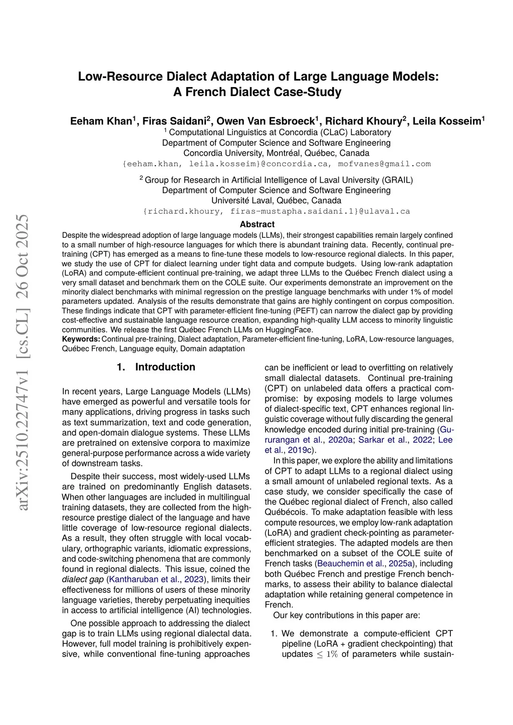 Despite the widespread adoption of large language models (LLMs), their strongest capabilities remain largely confined to a small number of high-resource languages for which there is abundant training data. Recently, continual pre-training (CPT) has emerged as a means to fine-tune these models to low-resource regional dialects. In this paper, we study the use of CPT for dialect learning under tight data and compute budgets. Using low-rank adaptation (LoRA) and compute-efficient continual pre-training, we adapt three LLMs to the Québec French dialect using a very small dataset and benchmark them on the COLE suite. Our experiments demonstrate an improvement on the minority dialect benchmarks with minimal regression on the prestige language benchmarks with under 1% of model parameters updated. Analysis of the results demonstrate that gains are highly contingent on corpus composition. These findings indicate that CPT with parameter-efficient fine-tuning (PEFT) can narrow the dialect gap by providing cost-effective and sustainable language resource creation, expanding high-quality LLM access to minority linguistic communities. We release the first Québec French LLMs on HuggingFace.