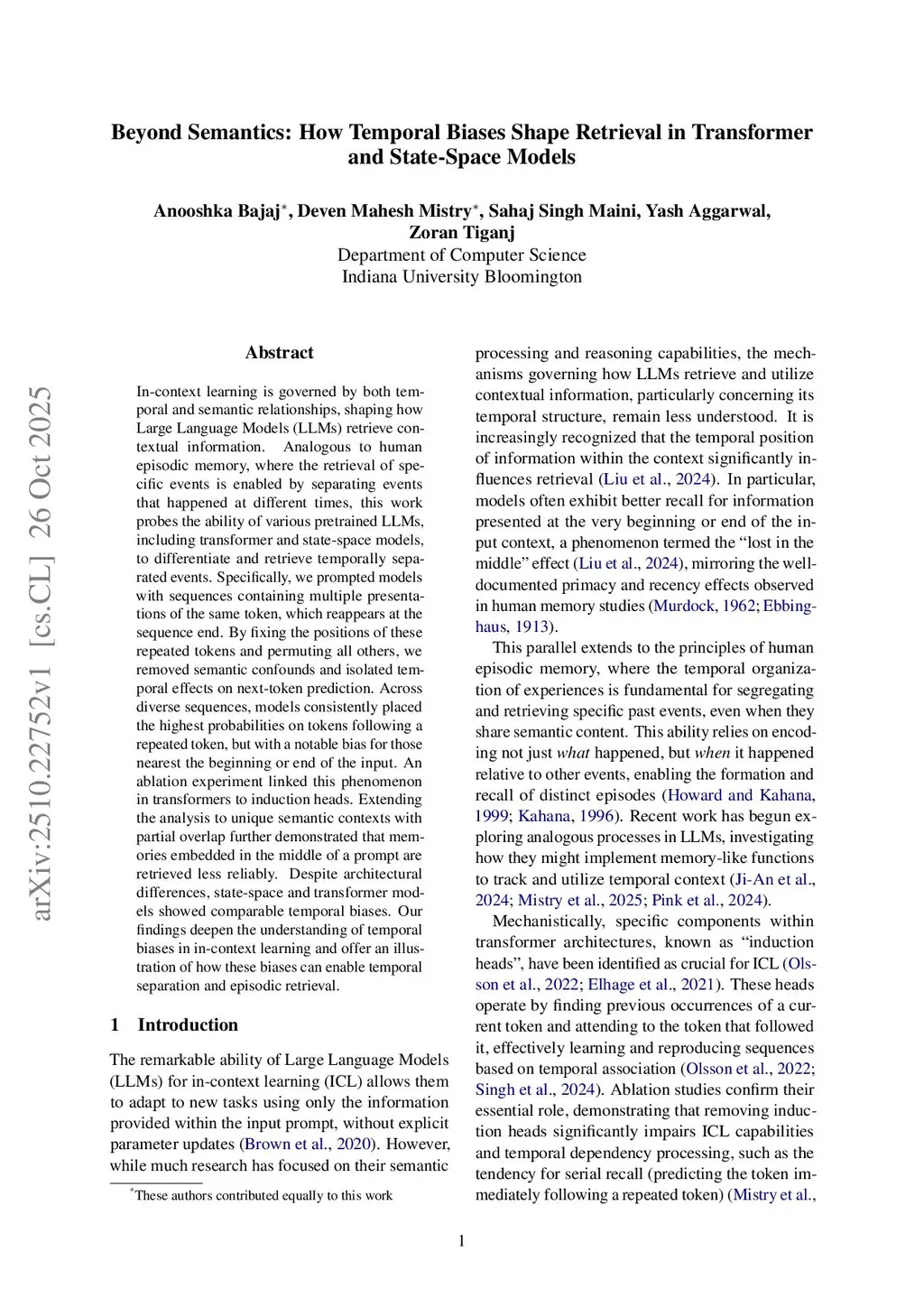 In-context learning is governed by both temporal and semantic relationships, shaping how Large Language Models (LLMs) retrieve contextual information. Analogous to human episodic memory, where the retrieval of specific events is enabled by separating events that happened at different times, this work probes the ability of various pretrained LLMs, including transformer and state-space models, to differentiate and retrieve temporally separated events. Specifically, we prompted models with sequences containing multiple presentations of the same token, which reappears at the sequence end. By fixing the positions of these repeated tokens and permuting all others, we removed semantic confounds and isolated temporal effects on next-token prediction. Across diverse sequences, models consistently placed the highest probabilities on tokens following a repeated token, but with a notable bias for those nearest the beginning or end of the input. An ablation experiment linked this phenomenon in transformers to induction heads. Extending the analysis to unique semantic contexts with partial overlap further demonstrated that memories embedded in the middle of a prompt are retrieved less reliably. Despite architectural differences, state-space and transformer models showed comparable temporal biases. Our findings deepen the understanding of temporal biases in in-context learning and offer an illustration of how these biases can enable temporal separation and episodic retrieval.