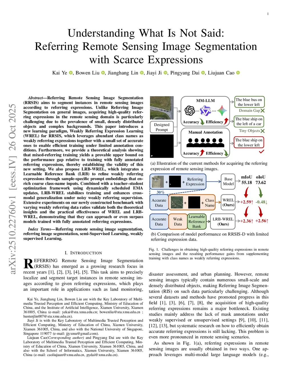 Referring Remote Sensing Image Segmentation (RRSIS) aims to segment instances in remote sensing images according to referring expressions. Unlike Referring Image Segmentation on general images, acquiring high-quality referring expressions in the remote sensing domain is particularly challenging due to the prevalence of small, densely distributed objects and complex backgrounds. This paper introduces a new learning paradigm, Weakly Referring Expression Learning (WREL) for RRSIS, which leverages abundant class names as weakly referring expressions together with a small set of accurate ones to enable efficient training under limited annotation conditions. Furthermore, we provide a theoretical analysis showing that mixed-referring training yields a provable upper bound on the performance gap relative to training with fully annotated referring expressions, thereby establishing the validity of this new setting. We also propose LRB-WREL, which integrates a Learnable Reference Bank (LRB) to refine weakly referring expressions through sample-specific prompt embeddings that enrich coarse class-name inputs. Combined with a teacher-student optimization framework using dynamically scheduled EMA updates, LRB-WREL stabilizes training and enhances cross-modal generalization under noisy weakly referring supervision. Extensive experiments on our newly constructed benchmark with varying weakly referring data ratios validate both the theoretical insights and the practical effectiveness of WREL and LRB-WREL, demonstrating that they can approach or even surpass models trained with fully annotated referring expressions.