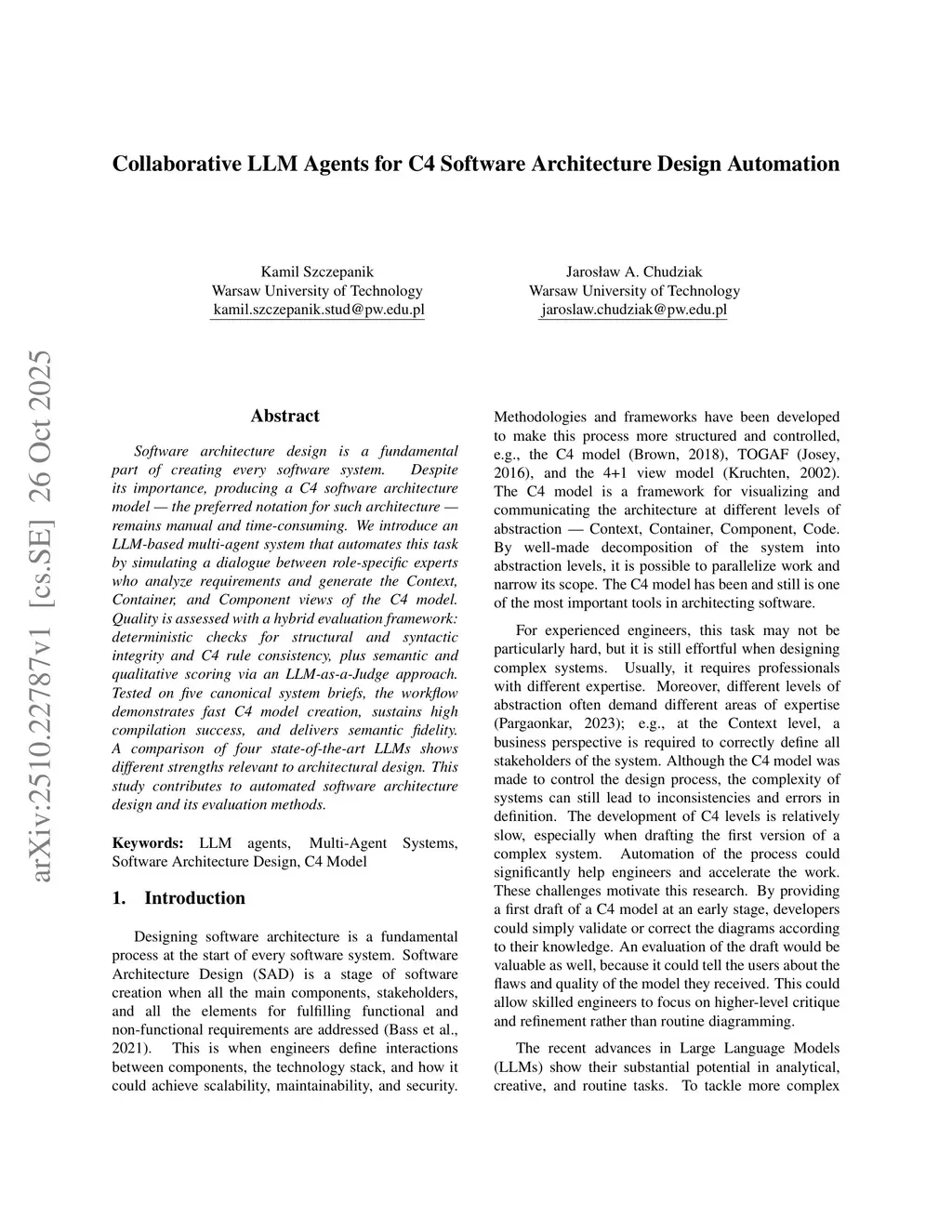 Software architecture design is a fundamental part of creating every software system. Despite its importance, producing a C4 software architecture model, the preferred notation for such architecture, remains manual and time-consuming. We introduce an LLM-based multi-agent system that automates this task by simulating a dialogue between role-specific experts who analyze requirements and generate the Context, Container, and Component views of the C4 model. Quality is assessed with a hybrid evaluation framework: deterministic checks for structural and syntactic integrity and C4 rule consistency, plus semantic and qualitative scoring via an LLM-as-a-Judge approach. Tested on five canonical system briefs, the workflow demonstrates fast C4 model creation, sustains high compilation success, and delivers semantic fidelity. A comparison of four state-of-the-art LLMs shows different strengths relevant to architectural design. This study contributes to automated software architecture design and its evaluation methods.