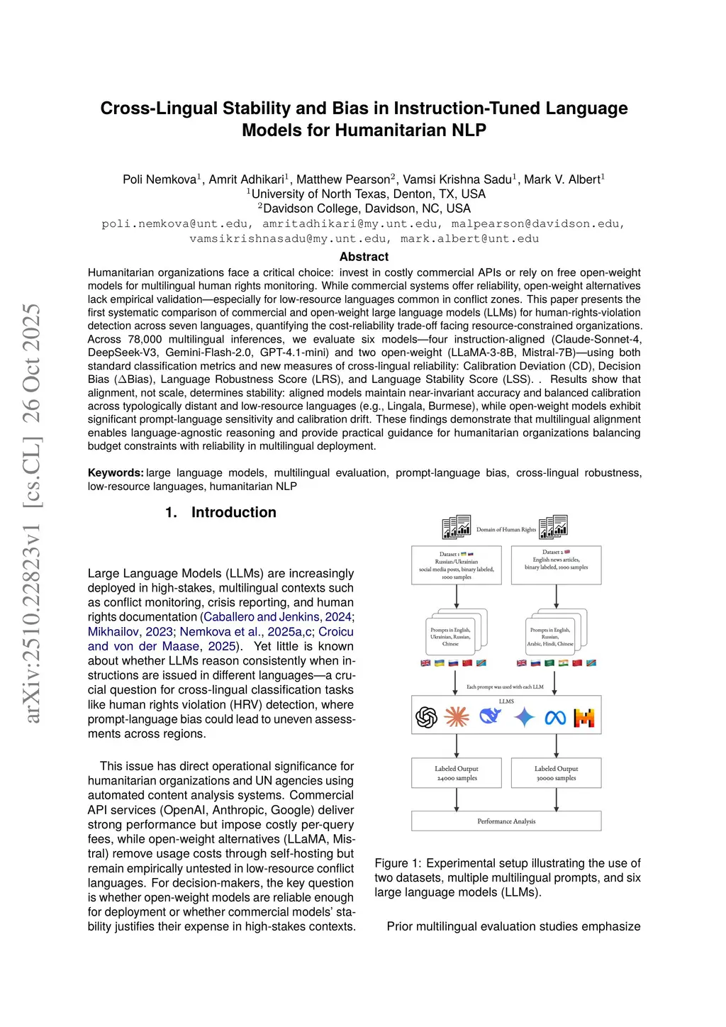 Humanitarian organizations face a critical choice: invest in costly commercial APIs or rely on free open-weight models for multilingual human rights monitoring. While commercial systems offer reliability, open-weight alternatives lack empirical validation -- especially for low-resource languages common in conflict zones. This paper presents the first systematic comparison of commercial and open-weight large language models (LLMs) for human-rights-violation detection across seven languages, quantifying the cost-reliability trade-off facing resource-constrained organizations. Across 78,000 multilingual inferences, we evaluate six models -- four instruction-aligned (Claude-Sonnet-4, DeepSeek-V3, Gemini-Flash-2.0, GPT-4.1-mini) and two open-weight (LLaMA-3-8B, Mistral-7B) -- using both standard classification metrics and new measures of cross-lingual reliability: Calibration Deviation (CD), Decision Bias (B), Language Robustness Score (LRS), and Language Stability Score (LSS). Results show that alignment, not scale, determines stability: aligned models maintain near-invariant accuracy and balanced calibration across typologically distant and low-resource languages (e.g., Lingala, Burmese), while open-weight models exhibit significant prompt-language sensitivity and calibration drift. These findings demonstrate that multilingual alignment enables language-agnostic reasoning and provide practical guidance for humanitarian organizations balancing budget constraints with reliability in multilingual deployment.