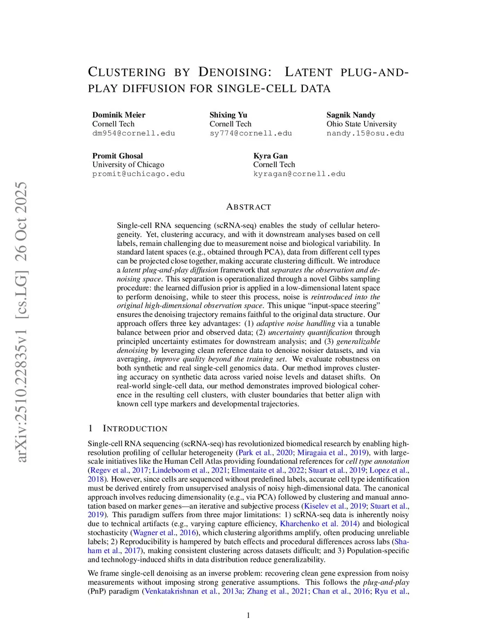 Single-cell RNA sequencing (scRNA-seq) enables the study of cellular heterogeneity. Yet, clustering accuracy, and with it downstream analyses based on cell labels, remain challenging due to measurement noise and biological variability. In standard latent spaces (e.g., obtained through PCA), data from different cell types can be projected close together, making accurate clustering difficult. We introduce a latent plug-and-play diffusion framework that separates the observation and denoising space. This separation is operationalized through a novel Gibbs sampling procedure: the learned diffusion prior is applied in a low-dimensional latent space to perform denoising, while to steer this process, noise is reintroduced into the original high-dimensional observation space. This unique "input-space steering" ensures the denoising trajectory remains faithful to the original data structure. Our approach offers three key advantages: (1) adaptive noise handling via a tunable balance between prior and observed data; (2) uncertainty quantification through principled uncertainty estimates for downstream analysis; and (3) generalizable denoising by leveraging clean reference data to denoise noisier datasets, and via averaging, improve quality beyond the training set. We evaluate robustness on both synthetic and real single-cell genomics data. Our method improves clustering accuracy on synthetic data across varied noise levels and dataset shifts. On real-world single-cell data, our method demonstrates improved biological coherence in the resulting cell clusters, with cluster boundaries that better align with known cell type markers and developmental trajectories.