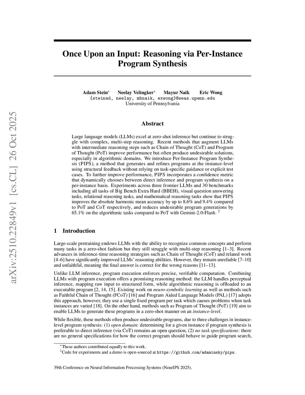 Large language models (LLMs) excel at zero-shot inference but continue to struggle with complex, multi-step reasoning. Recent methods that augment LLMs with intermediate reasoning steps such as Chain of Thought (CoT) and Program of Thought (PoT) improve performance but often produce undesirable solutions, especially in algorithmic domains. We introduce Per-Instance Program Synthesis (PIPS), a method that generates and refines programs at the instance-level using structural feedback without relying on task-specific guidance or explicit test cases. To further improve performance, PIPS incorporates a confidence metric that dynamically chooses between direct inference and program synthesis on a per-instance basis. Experiments across three frontier LLMs and 30 benchmarks including all tasks of Big Bench Extra Hard (BBEH), visual question answering tasks, relational reasoning tasks, and mathematical reasoning tasks show that PIPS improves the absolute harmonic mean accuracy by up to 8.6% and 9.4% compared to PoT and CoT respectively, and reduces undesirable program generations by 65.1% on the algorithmic tasks compared to PoT with Gemini-2.0-Flash.