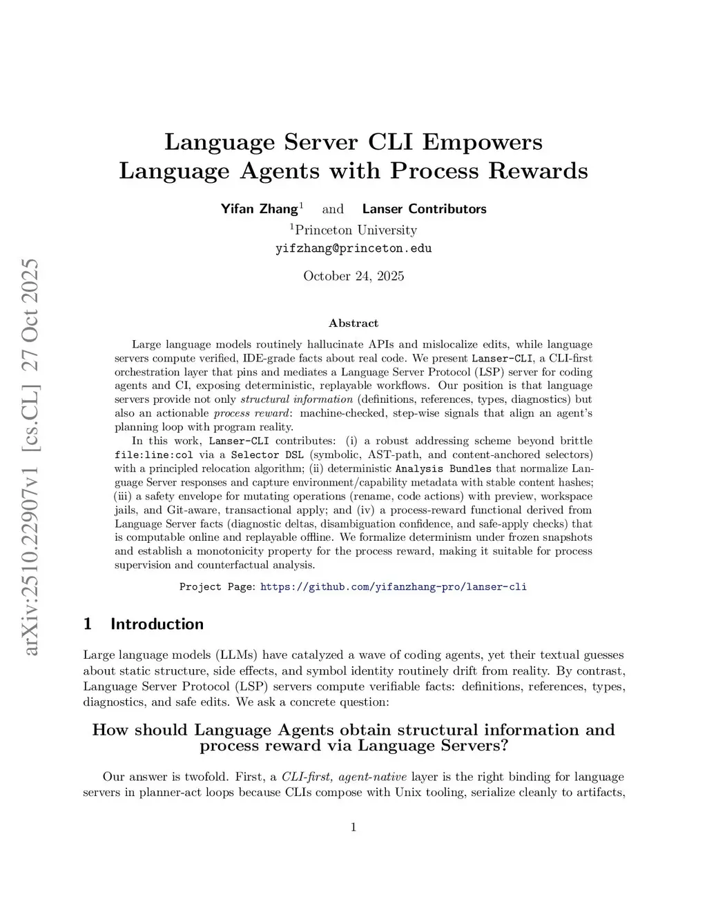 Large language models routinely hallucinate APIs and mislocalize edits, while language servers compute verified, IDE-grade facts about real code. We present Lanser-CLI, a CLI-first orchestration layer that pins and mediates a Language Server Protocol (LSP) server for coding agents and CI, exposing deterministic, replayable workflows. Our position is that language servers provide not only structural information (definitions, references, types, diagnostics) but also an actionable process reward: machine-checked, step-wise signals that align an agent's planning loop with program reality. In this work, Lanser-CLI contributes: (i) a robust addressing scheme beyond brittle "file:line:col" via a Selector DSL (symbolic, AST-path, and content-anchored selectors) with a principled relocation algorithm; (ii) deterministic Analysis Bundles that normalize Language Server responses and capture environment/capability metadata with stable content hashes; (iii) a safety envelope for mutating operations (rename, code actions) with preview, workspace jails, and Git-aware, transactional apply; and (iv) a process-reward functional derived from Language Server facts (diagnostic deltas, disambiguation confidence, and safe-apply checks) that is computable online and replayable offline. We formalize determinism under frozen snapshots and establish a monotonicity property for the process reward, making it suitable for process supervision and counterfactual analysis. Project Page:this https URL