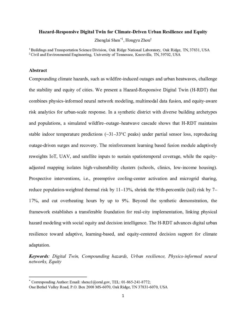Compounding climate hazards, such as wildfire-induced outages and urban heatwaves, challenge the stability and equity of cities. We present a Hazard-Responsive Digital Twin (H-RDT) that combines physics-informed neural network modeling, multimodal data fusion, and equity-aware risk analytics for urban-scale response. In a synthetic district with diverse building archetypes and populations, a simulated wildfire-outage-heatwave cascade shows that H-RDT maintains stable indoor temperature predictions (approximately 31 to 33 C) under partial sensor loss, reproducing outage-driven surges and recovery. The reinforcement learning based fusion module adaptively reweights IoT, UAV, and satellite inputs to sustain spatiotemporal coverage, while the equity-adjusted mapping isolates high-vulnerability clusters (schools, clinics, low-income housing). Prospective interventions, such as preemptive cooling-center activation and microgrid sharing, reduce population-weighted thermal risk by 11 to 13 percent, shrink the 95th-percentile (tail) risk by 7 to 17 percent, and cut overheating hours by up to 9 percent. Beyond the synthetic demonstration, the framework establishes a transferable foundation for real-city implementation, linking physical hazard modeling with social equity and decision intelligence. The H-RDT advances digital urban resilience toward adaptive, learning-based, and equity-centered decision support for climate adaptation.
