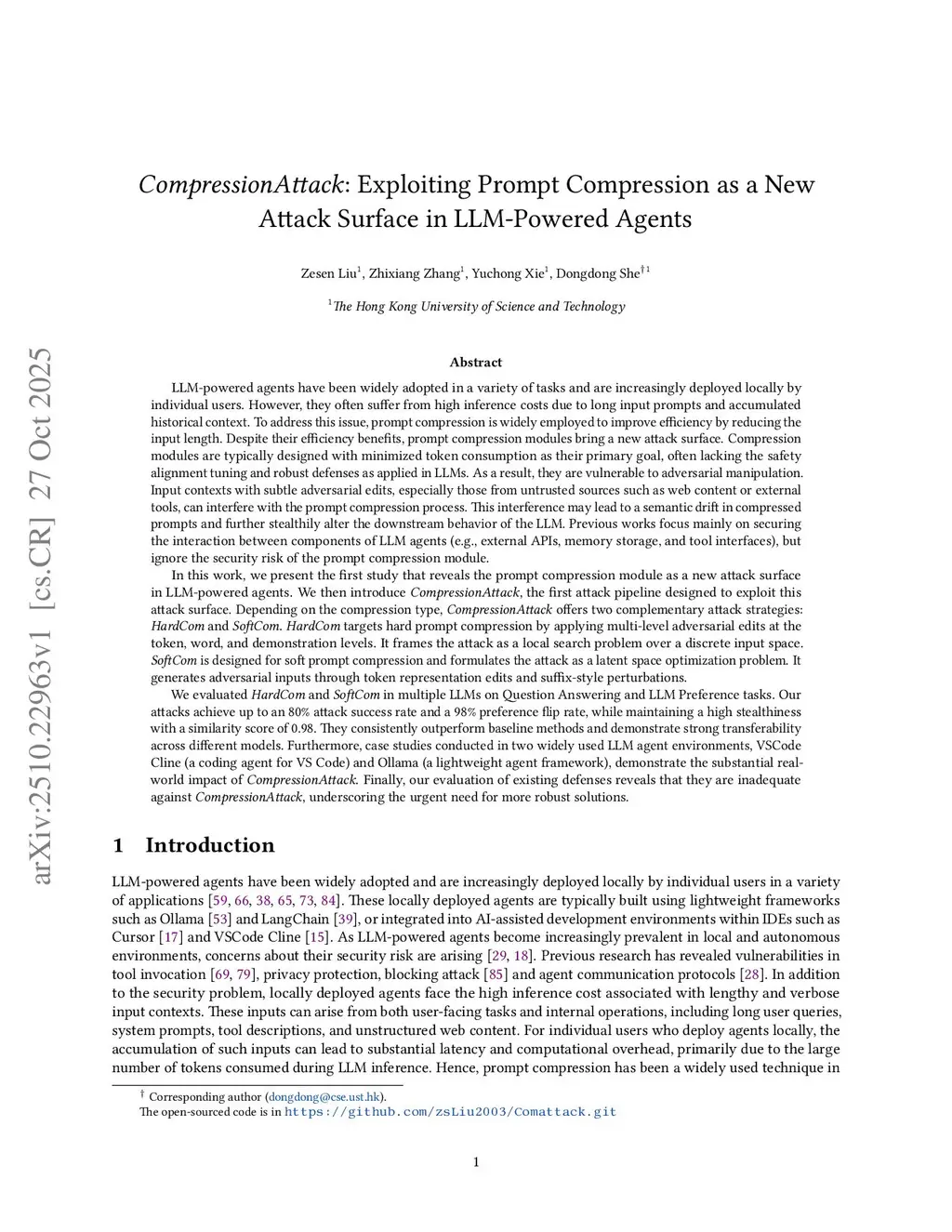 LLM-powered agents often use prompt compression to reduce inference costs, but this introduces a new security risk. Compression modules, which are optimized for efficiency rather than safety, can be manipulated by adversarial inputs, causing semantic drift and altering LLM behavior. This work identifies prompt compression as a novel attack surface and presents CompressionAttack, the first framework to exploit it. CompressionAttack includes two strategies: HardCom, which uses discrete adversarial edits for hard compression, and SoftCom, which performs latent-space perturbations for soft compression. Experiments on multiple LLMs show up to 80% attack success and 98% preference flips, while remaining highly stealthy and transferable. Case studies in VSCode Cline and Ollama confirm real-world impact, and current defenses prove ineffective, highlighting the need for stronger protections.