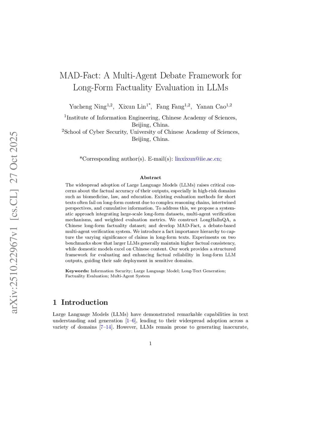 The widespread adoption of Large Language Models (LLMs) raises critical concerns about the factual accuracy of their outputs, especially in high-risk domains such as biomedicine, law, and education. Existing evaluation methods for short texts often fail on long-form content due to complex reasoning chains, intertwined perspectives, and cumulative information. To address this, we propose a systematic approach integrating large-scale long-form datasets, multi-agent verification mechanisms, and weighted evaluation metrics. We construct LongHalluQA, a Chinese long-form factuality dataset; and develop MAD-Fact, a debate-based multi-agent verification system. We introduce a fact importance hierarchy to capture the varying significance of claims in long-form texts. Experiments on two benchmarks show that larger LLMs generally maintain higher factual consistency, while domestic models excel on Chinese content. Our work provides a structured framework for evaluating and enhancing factual reliability in long-form LLM outputs, guiding their safe deployment in sensitive domains.