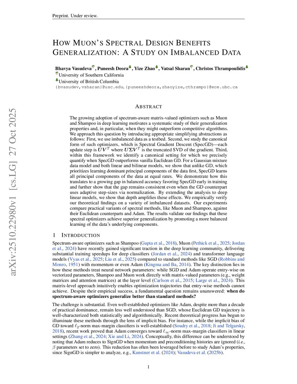 The growing adoption of spectrum-aware matrix-valued optimizers such as Muon and Shampoo in deep learning motivates a systematic study of their generalization properties and, in particular, when they might outperform competitive algorithms. We approach this question by introducing appropriate simplifying abstractions as follows: First, we use imbalanced data as a testbed. Second, we study the canonical form of such optimizers, which is Spectral Gradient Descent (SpecGD) -- each update step is where is the truncated SVD of the gradient. Third, within this framework we identify a canonical setting for which we precisely quantify when SpecGD outperforms vanilla Euclidean GD. For a Gaussian mixture data model and both linear and bilinear models, we show that unlike GD, which prioritizes learning dominant principal components of the data first, SpecGD learns all principal components of the data at equal rates. We demonstrate how this translates to a growing gap in class balanced loss favoring SpecGD early in training and further show that the gap remains consistent even when the GD counterpart uses adaptive step-sizes via normalization. By extending the analysis to deep linear models, we show that depth amplifies these effects. We empirically verify our theoretical findings on a variety of imbalanced datasets. Our experiments compare practical variants of spectral methods, like Muon and Shampoo, against their Euclidean counterparts and Adam. The results validate our findings that these spectral optimizers achieve superior generalization by promoting a more balanced learning of the data's underlying components.