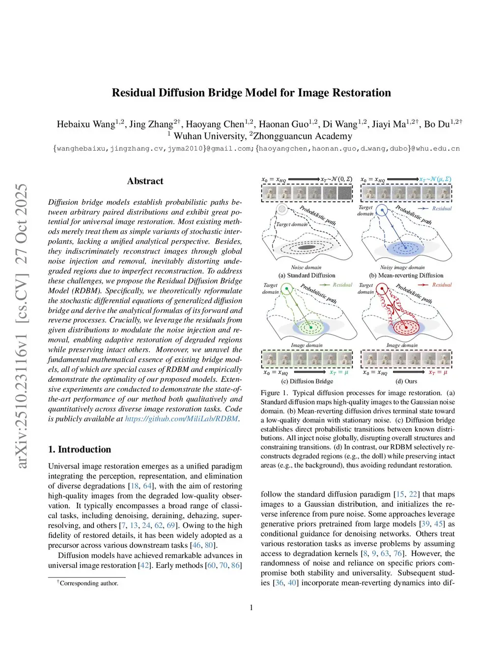 Diffusion bridge models establish probabilistic paths between arbitrary paired distributions and exhibit great potential for universal image restoration. Most existing methods merely treat them as simple variants of stochastic interpolants, lacking a unified analytical perspective. Besides, they indiscriminately reconstruct images through global noise injection and removal, inevitably distorting undegraded regions due to imperfect reconstruction. To address these challenges, we propose the Residual Diffusion Bridge Model (RDBM). Specifically, we theoretically reformulate the stochastic differential equations of generalized diffusion bridge and derive the analytical formulas of its forward and reverse processes. Crucially, we leverage the residuals from given distributions to modulate the noise injection and removal, enabling adaptive restoration of degraded regions while preserving intact others. Moreover, we unravel the fundamental mathematical essence of existing bridge models, all of which are special cases of RDBM and empirically demonstrate the optimality of our proposed models. Extensive experiments are conducted to demonstrate the state-of-the-art performance of our method both qualitatively and quantitatively across diverse image restoration tasks. Code is publicly available atthis https URL.