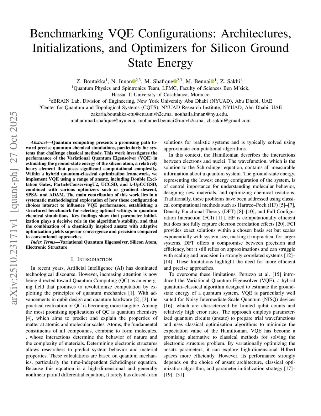 Quantum computing presents a promising path toward precise quantum chemical simulations, particularly for systems that challenge classical methods. This work investigates the performance of the Variational Quantum Eigensolver (VQE) in estimating the ground-state energy of the silicon atom, a relatively heavy element that poses significant computational complexity. Within a hybrid quantum-classical optimization framework, we implement VQE using a range of ansatz, including Double Excitation Gates, ParticleConservingU2, UCCSD, and k-UpCCGSD, combined with various optimizers such as gradient descent, SPSA, and ADAM. The main contribution of this work lies in a systematic methodological exploration of how these configuration choices interact to influence VQE performance, establishing a structured benchmark for selecting optimal settings in quantum chemical simulations. Key findings show that parameter initialization plays a decisive role in the algorithm's stability, and that the combination of a chemically inspired ansatz with adaptive optimization yields superior convergence and precision compared to conventional approaches.