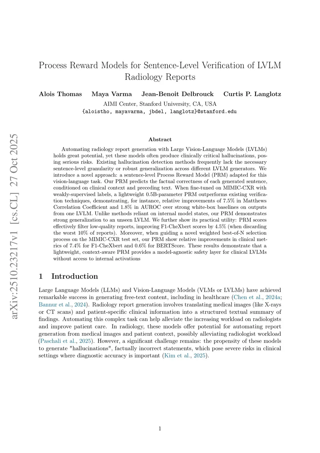 Automating radiology report generation with Large Vision-Language Models (LVLMs) holds great potential, yet these models often produce clinically critical hallucinations, posing serious risks. Existing hallucination detection methods frequently lack the necessary sentence-level granularity or robust generalization across different LVLM generators. We introduce a novel approach: a sentence-level Process Reward Model (PRM) adapted for this vision-language task. Our PRM predicts the factual correctness of each generated sentence, conditioned on clinical context and preceding text. When fine-tuned on MIMIC-CXR with weakly-supervised labels, a lightweight 0.5B-parameter PRM outperforms existing verification techniques, demonstrating, for instance, relative improvements of 7.5% in Matthews Correlation Coefficient and 1.8% in AUROC over strong white-box baselines on outputs from one LVLM. Unlike methods reliant on internal model states, our PRM demonstrates strong generalization to an unseen LVLM. We further show its practical utility: PRM scores effectively filter low-quality reports, improving F1-CheXbert scores by 4.5% (when discarding the worst 10% of reports). Moreover, when guiding a novel weighted best-of-N selection process on the MIMIC-CXR test set, our PRM show relative improvements in clinical metrics of 7.4% for F1-CheXbert and 0.6% for BERTScore. These results demonstrate that a lightweight, context-aware PRM provides a model-agnostic safety layer for clinical LVLMs without access to internal activations