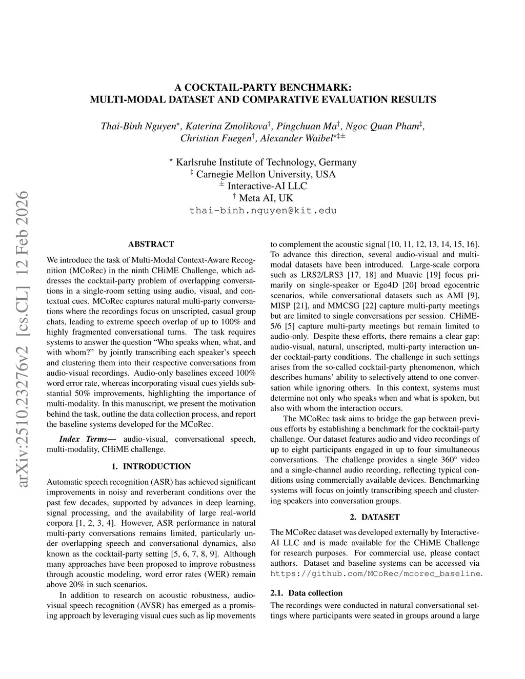 A Cocktail-Party Benchmark: Multi-Modal dataset and Comparative Evaluation Results