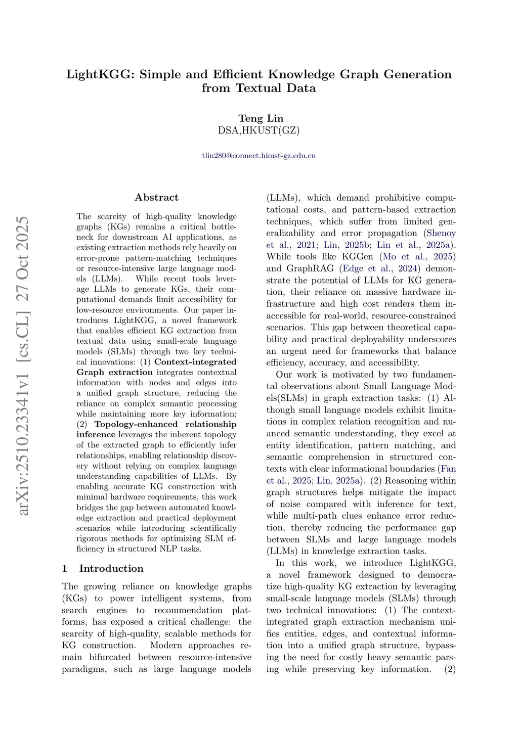 The scarcity of high-quality knowledge graphs (KGs) remains a critical bottleneck for downstream AI applications, as existing extraction methods rely heavily on error-prone pattern-matching techniques or resource-intensive large language models (LLMs). While recent tools leverage LLMs to generate KGs, their computational demands limit accessibility for low-resource environments. Our paper introduces LightKGG, a novel framework that enables efficient KG extraction from textual data using small-scale language models (SLMs) through two key technical innovations: (1) Context-integrated Graph extraction integrates contextual information with nodes and edges into a unified graph structure, reducing the reliance on complex semantic processing while maintaining more key information; (2) Topology-enhanced relationship inference leverages the inherent topology of the extracted graph to efficiently infer relationships, enabling relationship discovery without relying on complex language understanding capabilities of LLMs. By enabling accurate KG construction with minimal hardware requirements, this work bridges the gap between automated knowledge extraction and practical deployment scenarios while introducing scientifically rigorous methods for optimizing SLM efficiency in structured NLP tasks.