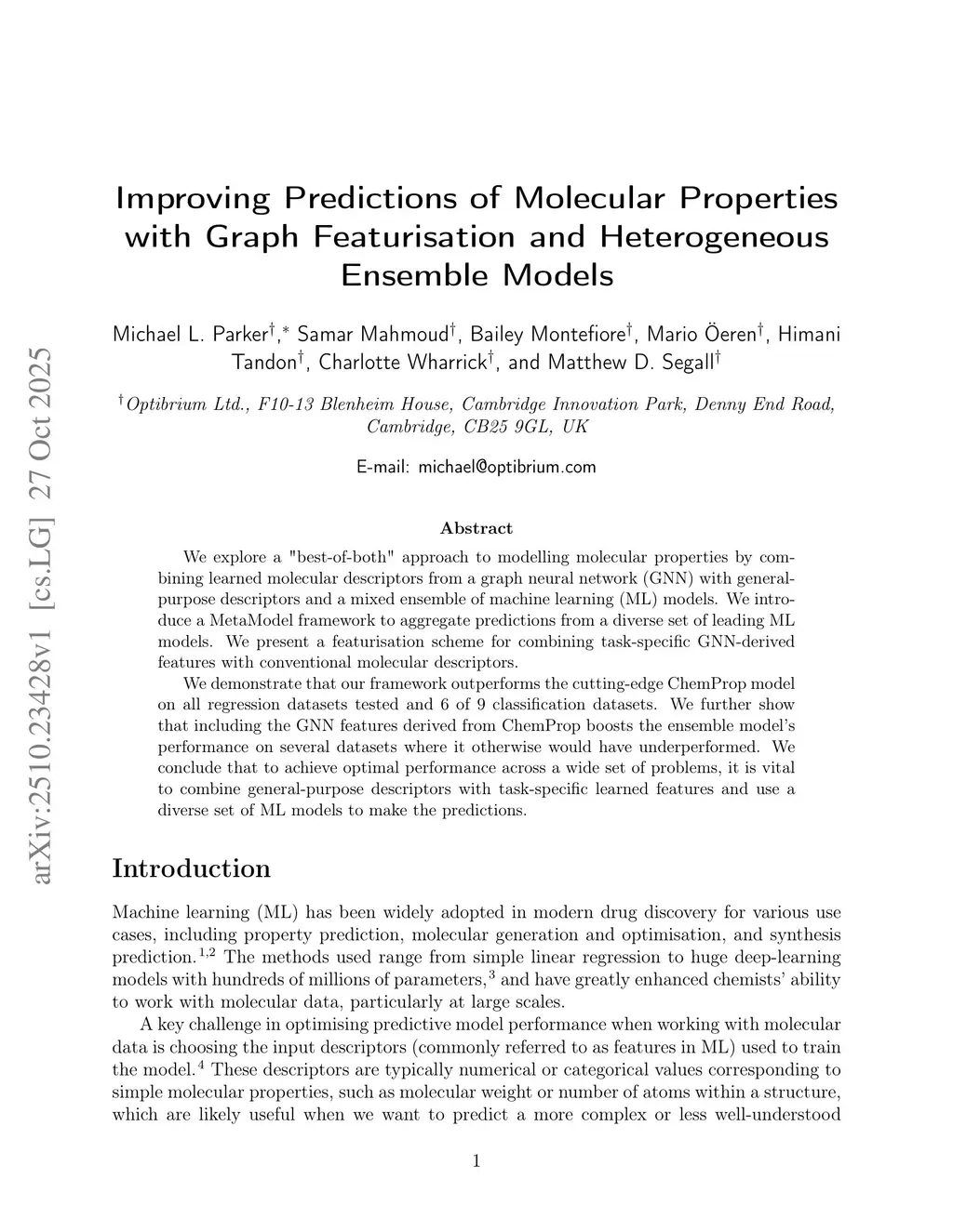 Improving Predictions of Molecular Properties with Graph Featurisation and Heterogeneous Ensemble Models