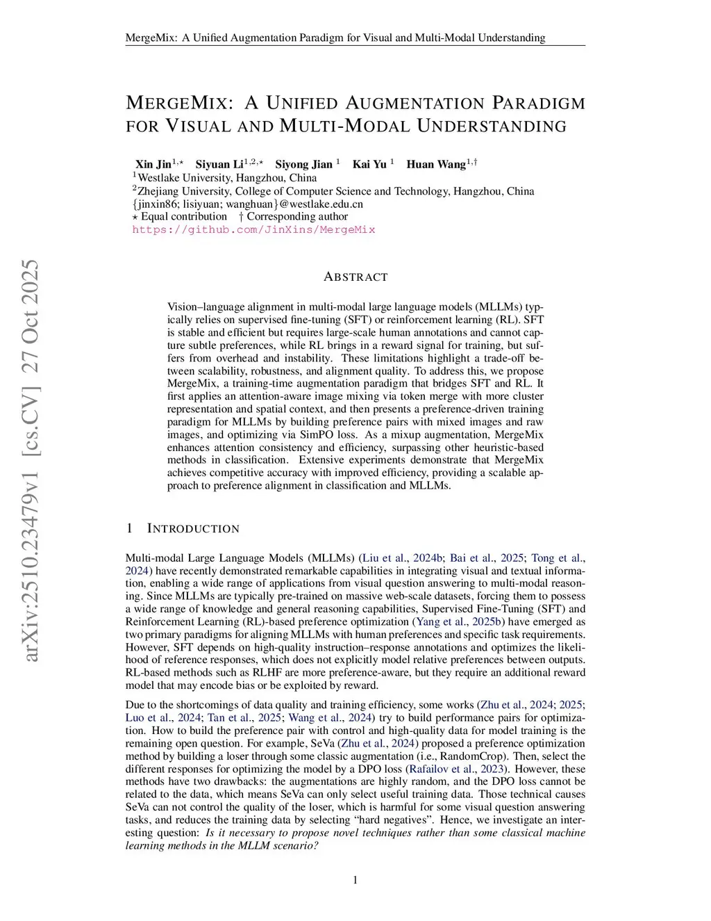 Vision-language alignment in multi-modal large language models (MLLMs) relies on supervised fine-tuning (SFT) or reinforcement learning (RL). To align multi-modal large language models (MLLMs) in the post-training stage, supervised fine-tuning (SFT) is a stable choice but requires human annotations and lacks task generalizations, while Reinforcement Learning (RL) searches for better answers from reward signals but suffers from computational overhead and instability. To achieve balance among scalability, efficiency, and alignment generalizations, we propose MergeMix, a unified paradigm that bridges SFT and RL with an efficient Token Merge based Mixup augmentation. As for the Mixup policy, we generate contextual aligned mixed images with the corresponding labels according to the merged attention maps with cluster regions. Then, we enhance the preference-driven paradigm for MLLMs by building preference pairs with raw images and MergeMix-generated ones and optimizing the soft preference margin with the mixed SimPO loss. Extensive experiments demonstrate that MergeMix not only achieves dominant classification accuracy as an augmentation method but also improves generalization abilities and alignment of MLLMs, providing a new learning paradigm for preference alignment with training efficiency and stability.