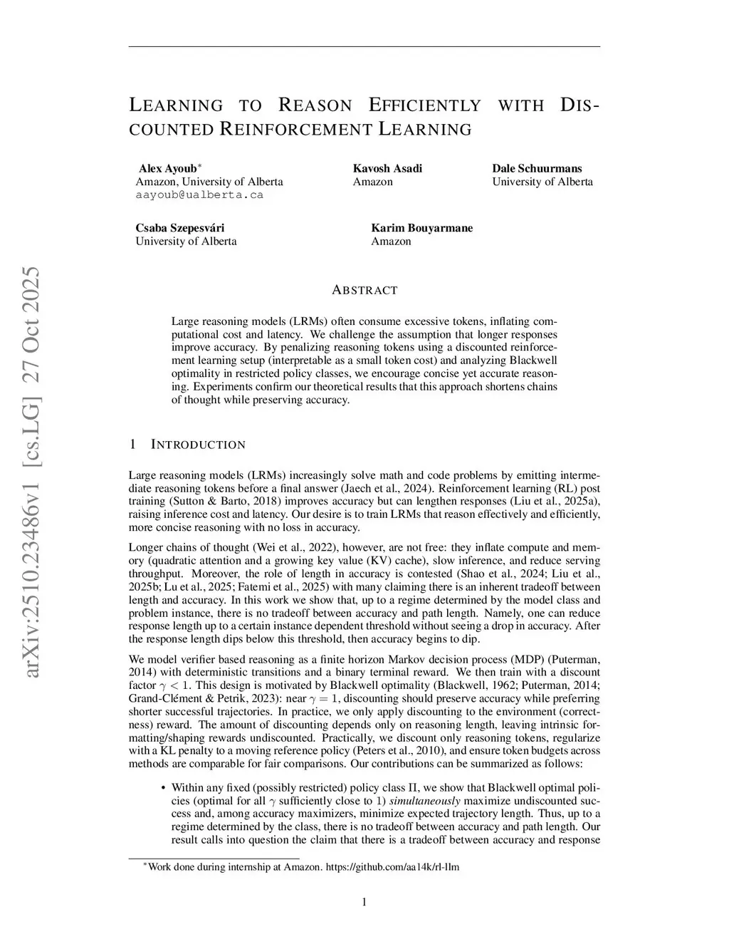 Large reasoning models (LRMs) often consume excessive tokens, inflating computational cost and latency. We challenge the assumption that longer responses improve accuracy. By penalizing reasoning tokens using a discounted reinforcement learning setup (interpretable as a small token cost) and analyzing Blackwell optimality in restricted policy classes, we encourage concise yet accurate reasoning. Experiments confirm our theoretical results that this approach shortens chains of thought while preserving accuracy.