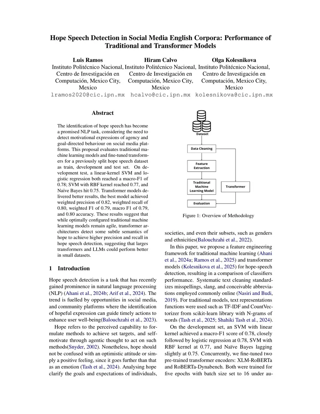 The identification of hope speech has become a promised NLP task, considering the need to detect motivational expressions of agency and goal-directed behaviour on social media platforms. This proposal evaluates traditional machine learning models and fine-tuned transformers for a previously split hope speech dataset as train, development and test set. On development test, a linear-kernel SVM and logistic regression both reached a macro-F1 of 0.78; SVM with RBF kernel reached 0.77, and Naïve Bayes hit 0.75. Transformer models delivered better results, the best model achieved weighted precision of 0.82, weighted recall of 0.80, weighted F1 of 0.79, macro F1 of 0.79, and 0.80 accuracy. These results suggest that while optimally configured traditional machine learning models remain agile, transformer architectures detect some subtle semantics of hope to achieve higher precision and recall in hope speech detection, suggesting that larges transformers and LLMs could perform better in small datasets.