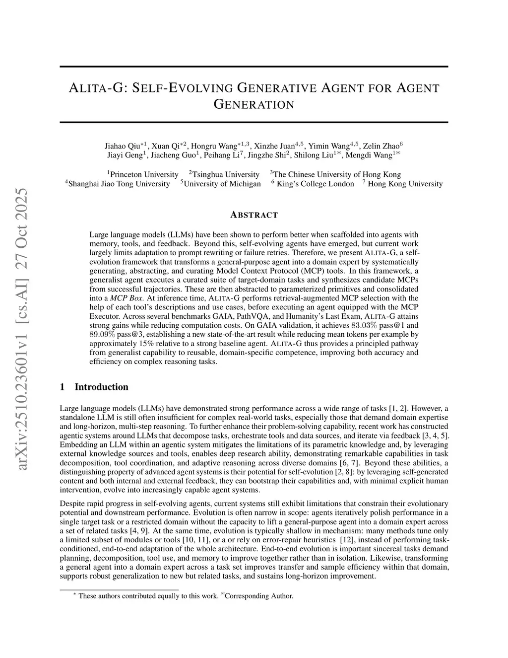 Large language models (LLMs) have been shown to perform better when scaffolded into agents with memory, tools, and feedback. Beyond this, self-evolving agents have emerged, but current work largely limits adaptation to prompt rewriting or failure retries. Therefore, we present ALITA-G, a self-evolution framework that transforms a general-purpose agent into a domain expert by systematically generating, abstracting, and curating Model Context Protocol (MCP) tools. In this framework, a generalist agent executes a curated suite of target-domain tasks and synthesizes candidate MCPs from successful trajectories. These are then abstracted to parameterized primitives and consolidated into an MCP Box. At inference time, ALITA-G performs retrieval-augmented MCP selection with the help of each tool's descriptions and use cases, before executing an agent equipped with the MCP Executor. Across several benchmarks GAIA, PathVQA, and Humanity's Last Exam, ALITA-G attains strong gains while reducing computation costs. On GAIA validation, it achieves 83.03% pass@1 and 89.09% pass@3, establishing a new state-of-the-art result while reducing mean tokens per example by approximately 15% relative to a strong baseline agent. ALITA-G thus provides a principled pathway from generalist capability to reusable, domain-specific competence, improving both accuracy and efficiency on complex reasoning tasks.