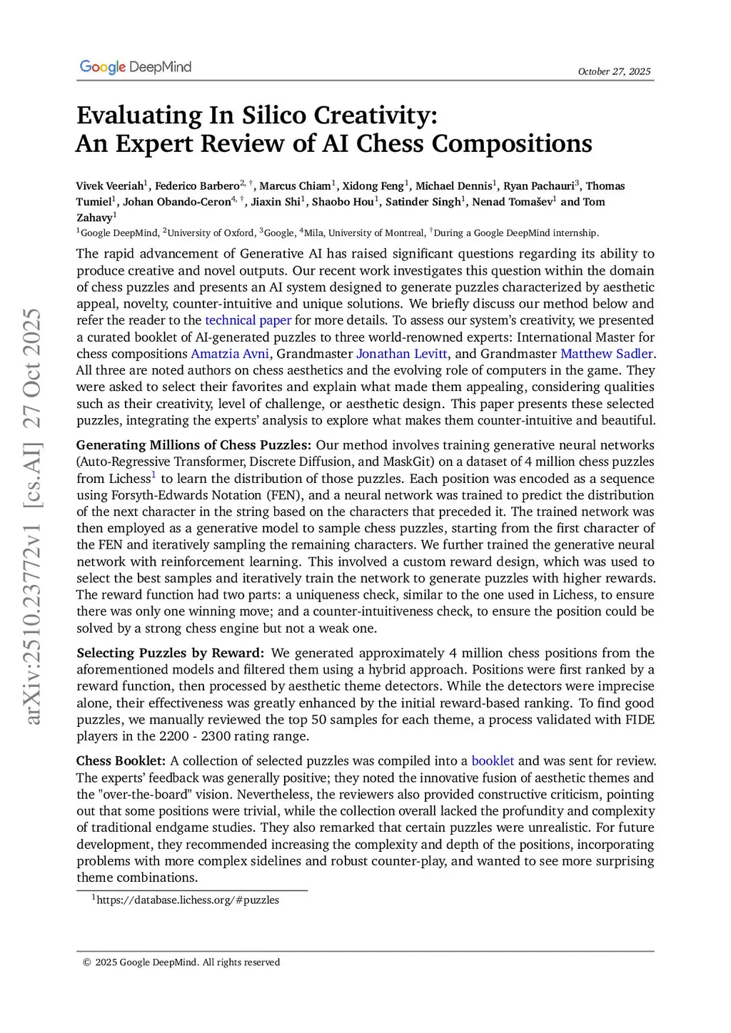 The rapid advancement of Generative AI has raised significant questions regarding its ability to produce creative and novel outputs. Our recent work investigates this question within the domain of chess puzzles and presents an AI system designed to generate puzzles characterized by aesthetic appeal, novelty, counter-intuitive and unique solutions. We briefly discuss our method below and refer the reader to the technical paper for more details. To assess our system's creativity, we presented a curated booklet of AI-generated puzzles to three world-renowned experts: International Master for chess compositions Amatzia Avni, Grandmaster Jonathan Levitt, and Grandmaster Matthew Sadler. All three are noted authors on chess aesthetics and the evolving role of computers in the game. They were asked to select their favorites and explain what made them appealing, considering qualities such as their creativity, level of challenge, or aesthetic design.