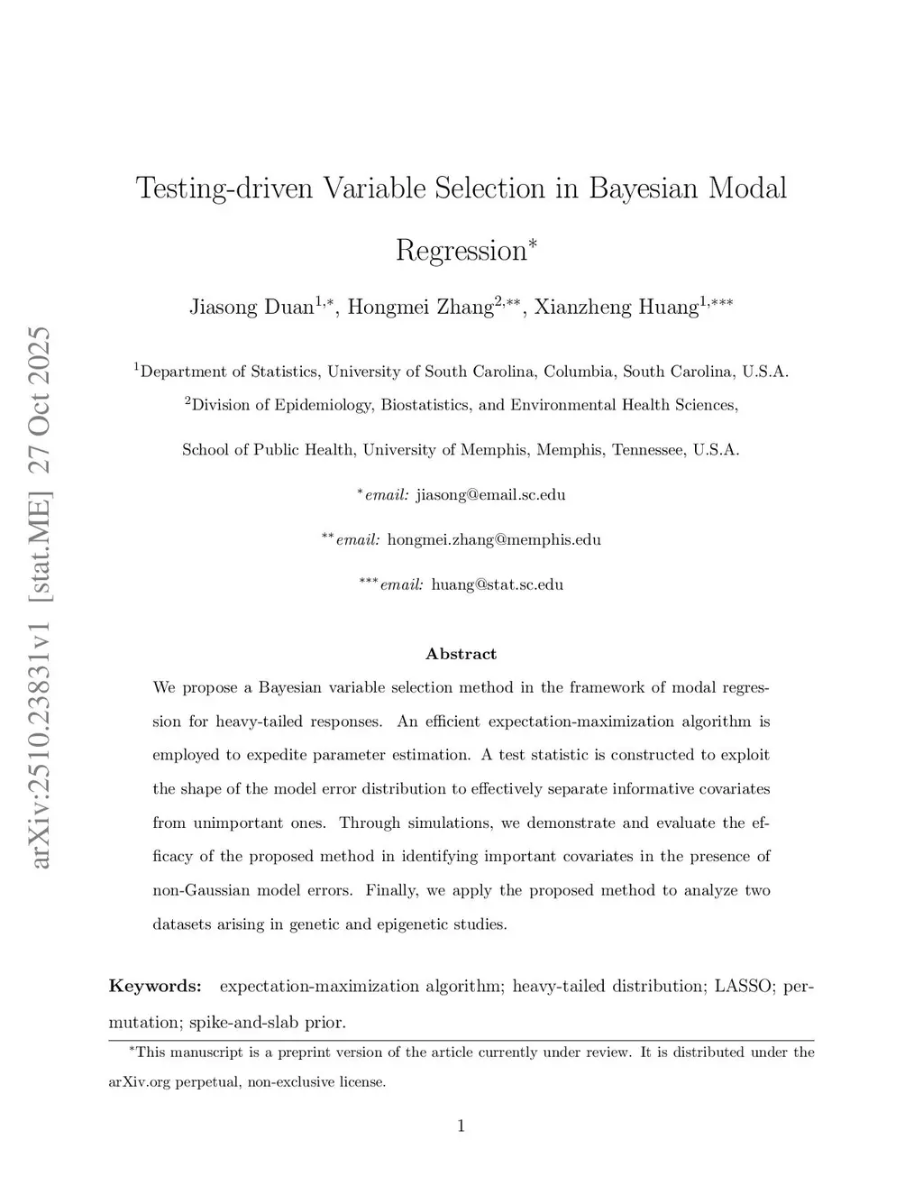 We propose a Bayesian variable selection method in the framework of modal regression for heavy-tailed responses. An efficient expectation-maximization algorithm is employed to expedite parameter estimation. A test statistic is constructed to exploit the shape of the model error distribution to effectively separate informative covariates from unimportant ones. Through simulations, we demonstrate and evaluate the efficacy of the proposed method in identifying important covariates in the presence of non-Gaussian model errors. Finally, we apply the proposed method to analyze two datasets arising in genetic and epigenetic studies.