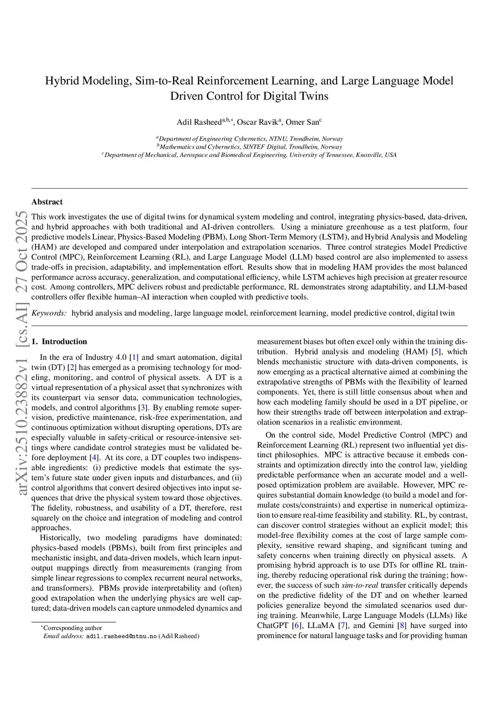 Hybrid Modeling, Sim-to-Real Reinforcement Learning, and Large Language Model Driven Control for Digital Twins