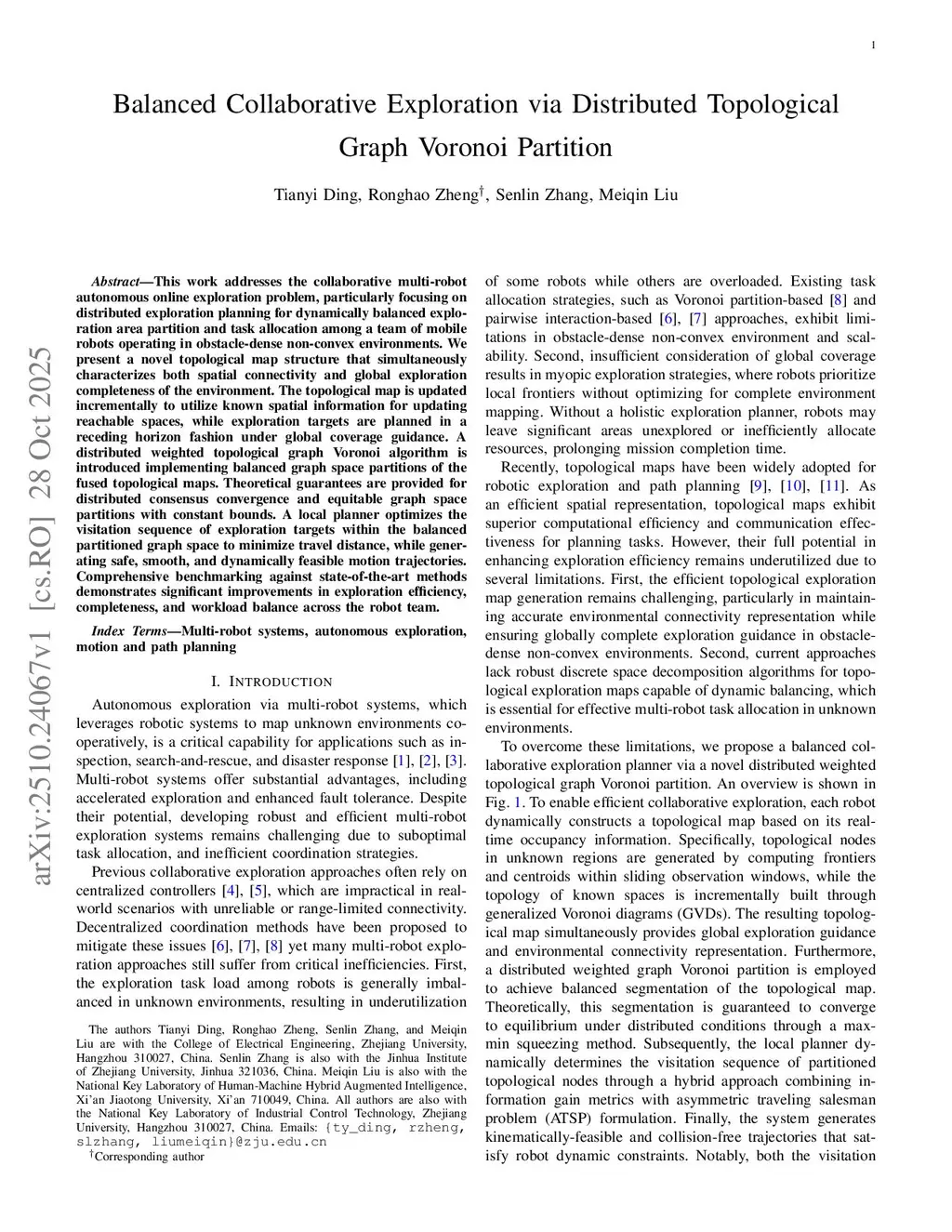 This work addresses the collaborative multi-robot autonomous online exploration problem, particularly focusing on distributed exploration planning for dynamically balanced exploration area partition and task allocation among a team of mobile robots operating in obstacle-dense non-convex environments.We present a novel topological map structure that simultaneously characterizes both spatial connectivity and global exploration completeness of the environment. The topological map is updated incrementally to utilize known spatial information for updating reachable spaces, while exploration targets are planned in a receding horizon fashion under global coverage guidance.A distributed weighted topological graph Voronoi algorithm is introduced implementing balanced graph space partitions of the fused topological maps. Theoretical guarantees are provided for distributed consensus convergence and equitable graph space partitions with constant bounds.A local planner optimizes the visitation sequence of exploration targets within the balanced partitioned graph space to minimize travel distance, while generating safe, smooth, and dynamically feasible motion trajectories.Comprehensive benchmarking against state-of-the-art methods demonstrates significant improvements in exploration efficiency, completeness, and workload balance across the robot team.