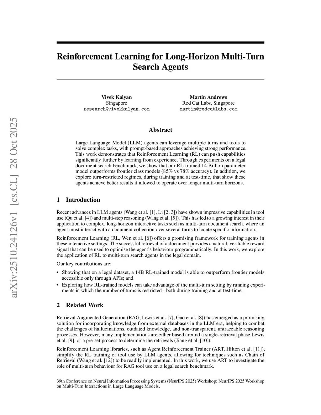 Large Language Model (LLM) agents can leverage multiple turns and tools to solve complex tasks, with prompt-based approaches achieving strong performance. This work demonstrates that Reinforcement Learning (RL) can push capabilities significantly further by learning from experience. Through experiments on a legal document search benchmark, we show that our RL-trained 14 Billion parameter model outperforms frontier class models (85% vs 78% accuracy). In addition, we explore turn-restricted regimes, during training and at test-time, that show these agents achieve better results if allowed to operate over longer multi-turn horizons.